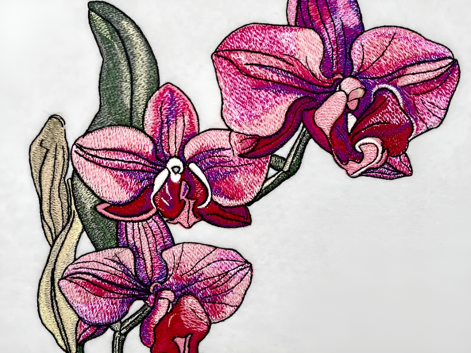 Điểm đặc biệt khiến tranh thêu hoa lan trở nên cuốn hút nằm ở nghệ thuật thêu tay truyền thống. Mỗi tác phẩm được tạo nên từ hàng vạn mũi chỉ nhỏ, đan xen uyển chuyển trên nền vải lụa mịn màng. Dưới đôi tay khéo léo của nghệ nhân, từng cánh lan hiện lên mềm mại, có độ chuyển màu tinh tế và độ sáng tối tự nhiên như thật.
