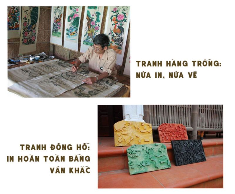 Nếu như tranh Đông Hồ in cả viền nét lẫn màu sắc bằng bản khắc gỗ, thì tranh Hàng Trống lại chỉ sử dụng ván khắc gỗ để in phần nét trên nền giấy dó. Sau đó, nghệ nhân sẽ tô màu thủ công, tạo nên những sắc độ mượt mà và sống động.