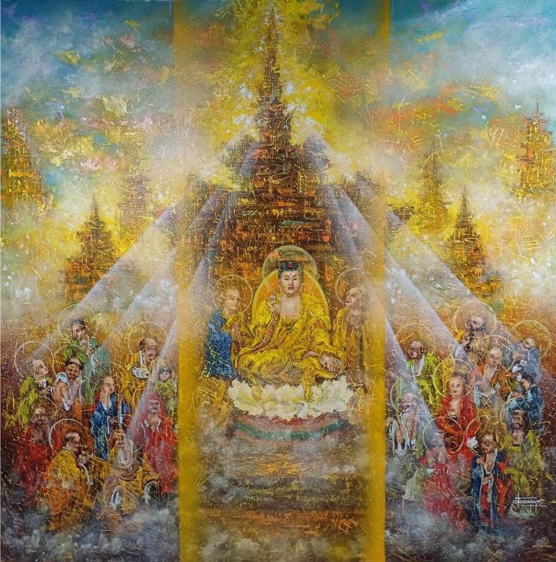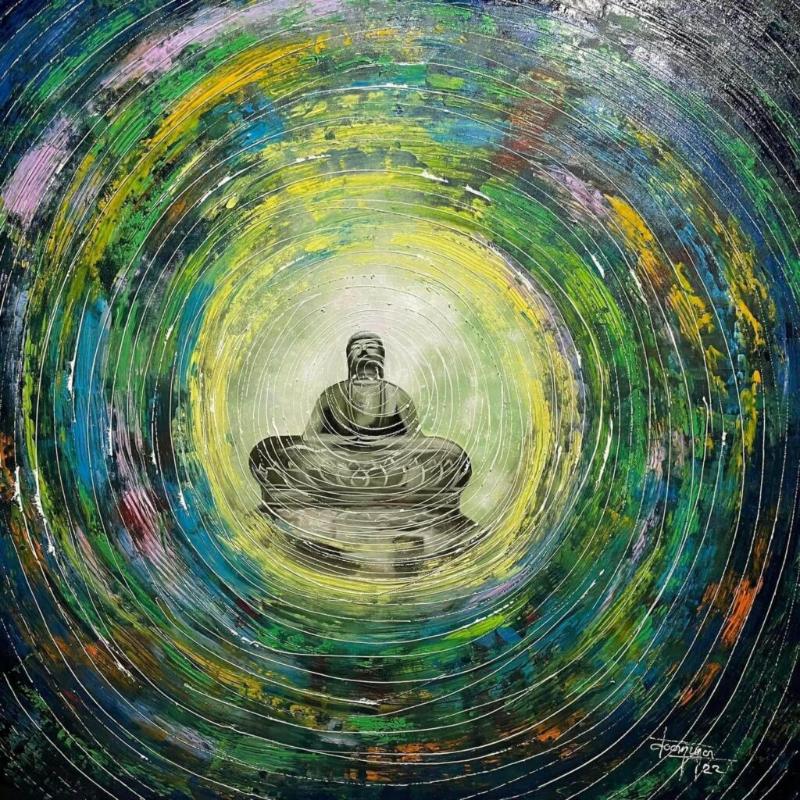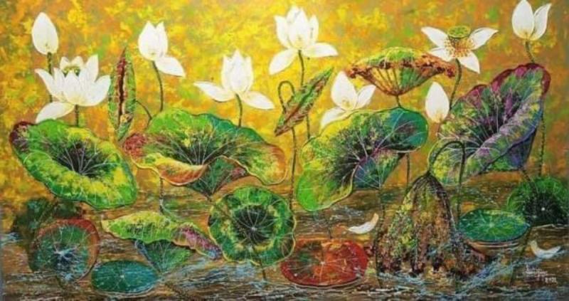 Các chủ đề quen thuộc trong tranh của ông là Sen – Phật, hình tượng siêu thực, giấc mơ, và cả sự giằng co giữa sáng – tối. Mỗi tác phẩm như một lát cắt tâm trạng, vừa dị biệt vừa cuốn hút. Cảm xúc không chỉ là chất liệu, mà còn là “kim chỉ nam” dẫn dắt ông đi suốt hành trình hội họa.