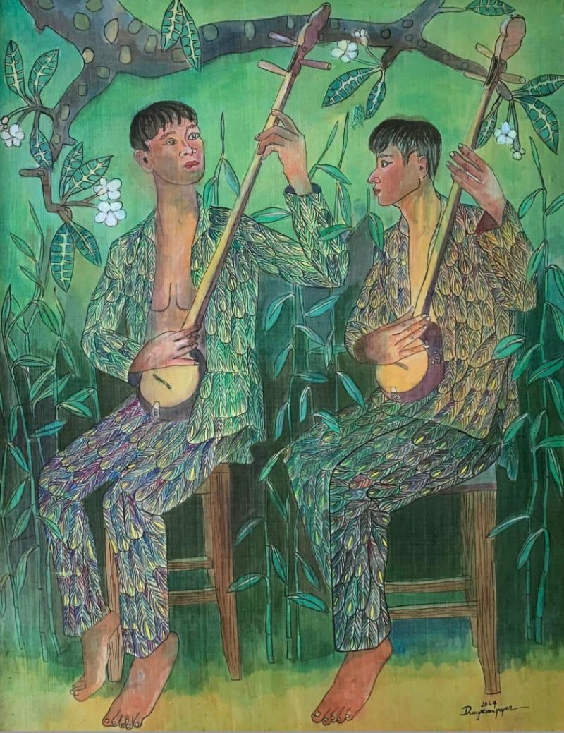 - Trong “Tranh cổ xưa”, ông không phục dựng lịch sử một cách chi tiết, mà lồng cảm xúc đương đại vào ký ức văn hóa, qua y phục, họa tiết và dáng ngồi truyền thống đã được cách điệu.