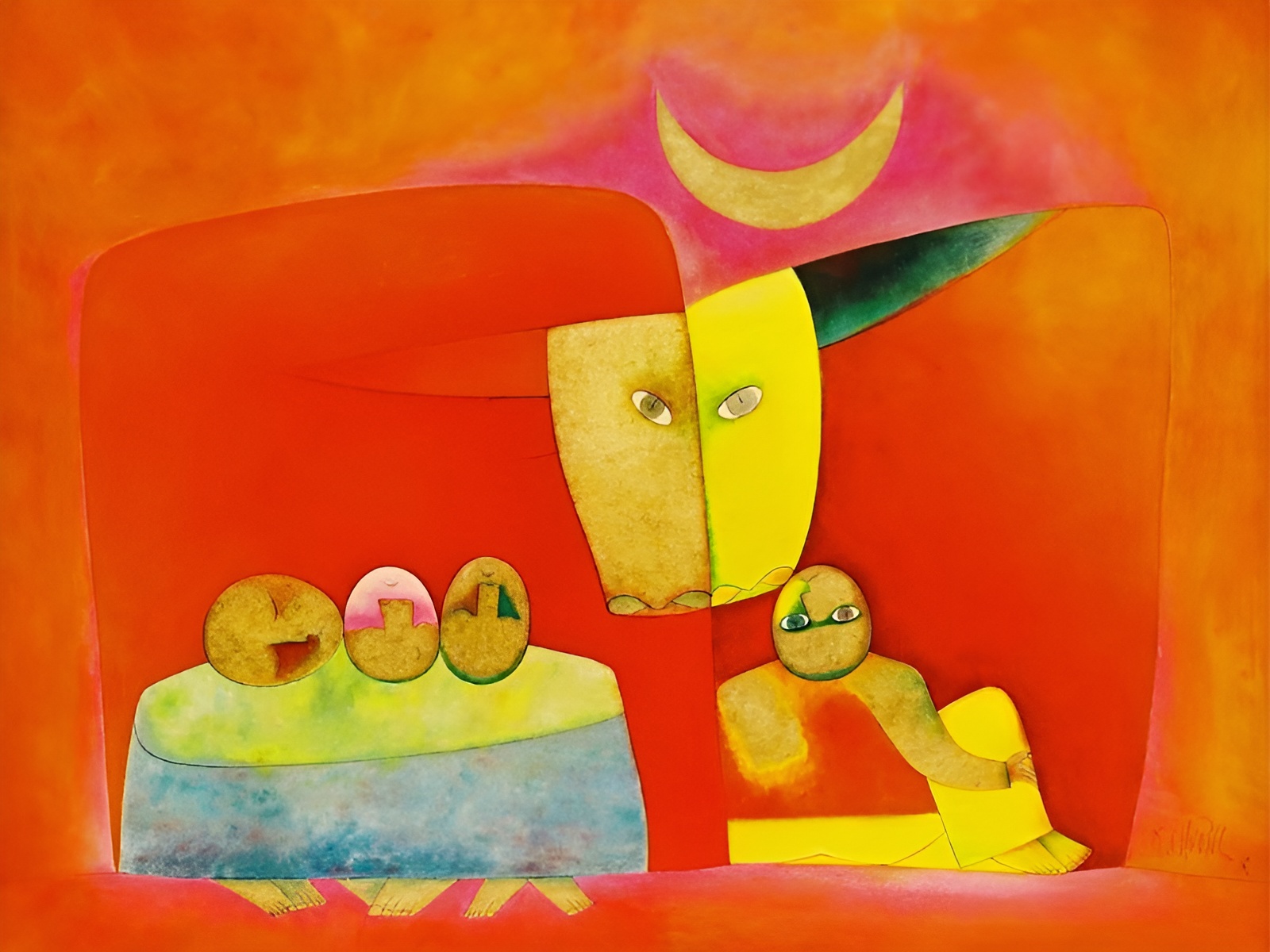 Điểm dễ nhận diện trong tranh Thành Chương là sự hòa trộn giữa cổ điển và hiện đại. Những chi tiết dân gian được cách điệu thành hình khối giản lược, màu sắc mạnh mẽ nhưng vẫn giữ sự hài hòa. Chính cách tạo hình này đem đến cảm giác vừa quen thuộc, vừa mới lạ, giúp tranh của ông có bản sắc riêng, không thể nhầm lẫn.