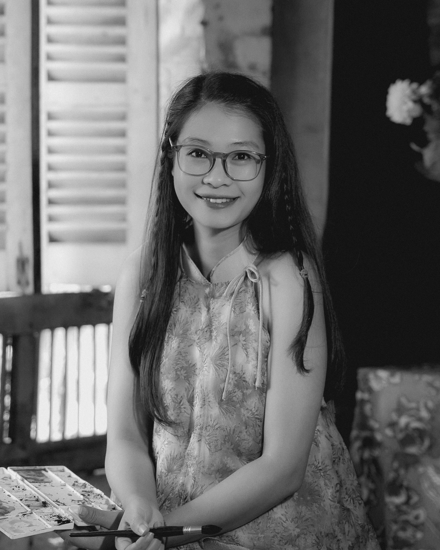 Sinh năm 1990, họa sĩ Vũ Thùy Mai sớm khẳng định phong cách riêng với tranh lụa sau khi tốt nghiệp Đại học Sư phạm Nghệ thuật Trung ương và Thạc sĩ Văn hóa học. Cô chọn chất liệu mong manh này để gửi gắm những lát cắt ký ức: ánh sáng ban mai, tiếng chim, màu lá, sắc hoa, những điều tưởng nhỏ bé nhưng lưu giữ cả hơi thở tuổi thơ miền núi.
