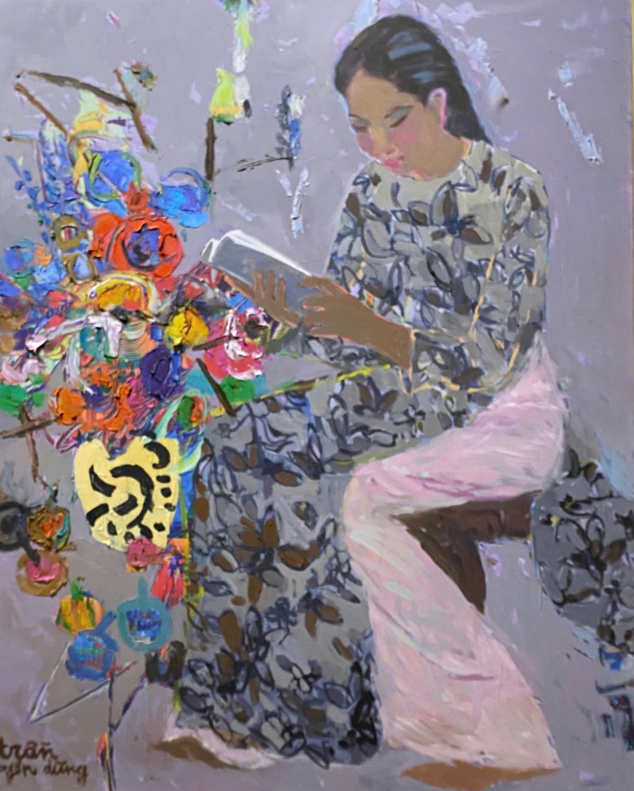 “Bên Trang Sách” ghi lại một khoảnh khắc tĩnh lặng khi người phụ nữ ngồi đọc sách, dáng nghiêng mềm mại giữa không gian bảng lảng sắc tím xám. Những mảng hoa rực rỡ bên cạnh như dòng suy tưởng bung nở, đối lập mà hài hòa với vẻ trầm tư của nhân vật. Nét vẽ phóng khoáng, lớp màu dày tạo cảm giác vừa thực vừa mơ, nơi tri thức và cảm xúc giao thoa. Tác phẩm không kể câu chuyện ồn ào, mà mời người xem chậm lại, lắng nghe nhịp thở dịu dàng của nội tâm, nơi cái đẹp đến từ sự yên tĩnh và suy ngẫm.