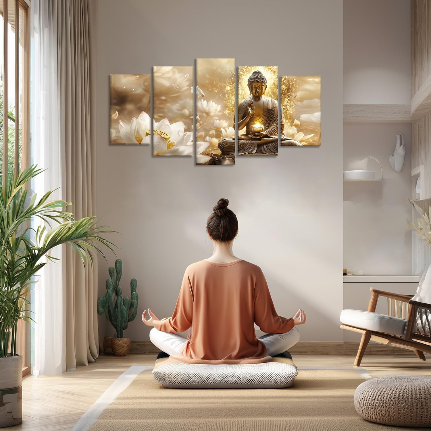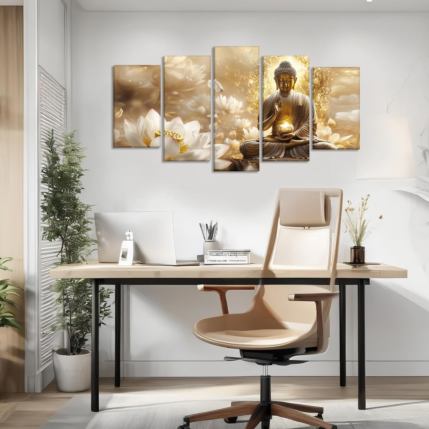 Bộ 5 tranh khắc họa Phật uy nghi thiền định trên đài sen trắng, tỏa hào quang vàng kim huyền ảo giữa nền tối trầm mặc mang sự tĩnh tâm, bình an.