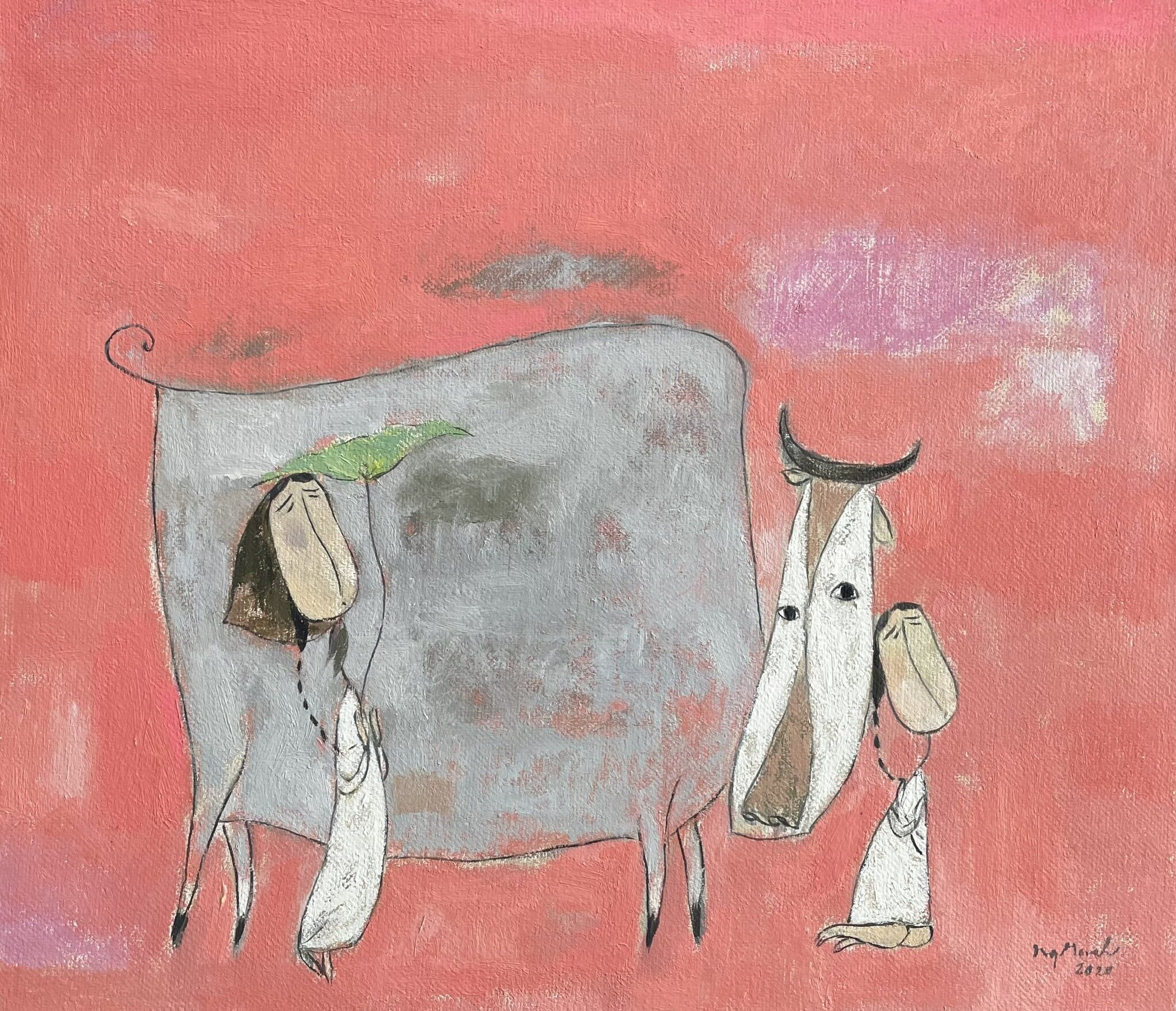 “Chăn Trâu” sáng tác năm 2020, hiện lên trong gam hồng tươi sáng, nơi những cô bé cậu bé nương tựa bên chú trâu hiền lành, dáng hình giản lược mà đầy gợi cảm. Bút pháp tối giản, các đường nét mềm và gãy được tiết chế, kết hợp mảng màu phẳng tạo nên nhịp điệu thị giác thanh thoát. Hình ảnh ấy gợi về tuổi thơ thôn dã trong trẻo, nơi trò chơi, giấc mơ và sự an yên nảy nở từ những ngày tháng hồn nhiên gắn bó cùng thiên nhiên và con vật thân quen.