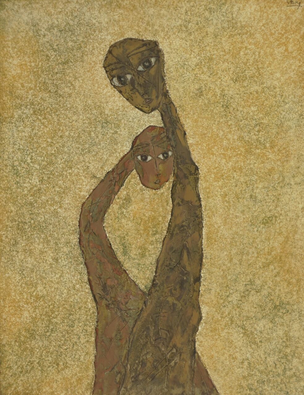 “Chị Em” sáng tác năm…, khắc họa hai gương mặt hòa quyện trong những thân hình mảnh mai như hòa tan vào nhau, tạo nên một khối thống nhất của sự gắn bó. Nền vàng hạt mịn gợi cảm giác thời gian lắng đọng, như ký ức được phủ bụi mà vẫn lung linh. Đôi mắt lớn, sâu và lặng, mở ra thế giới nội tâm giàu tình cảm. Bức tranh gợi nhắc đến sự nâng đỡ và chở che trong mối quan hệ gia đình, nơi tình chị em trở thành chỗ dựa tinh thần, nuôi dưỡng sự bền vững và niềm tin giữa cuộc đời.