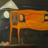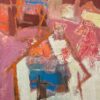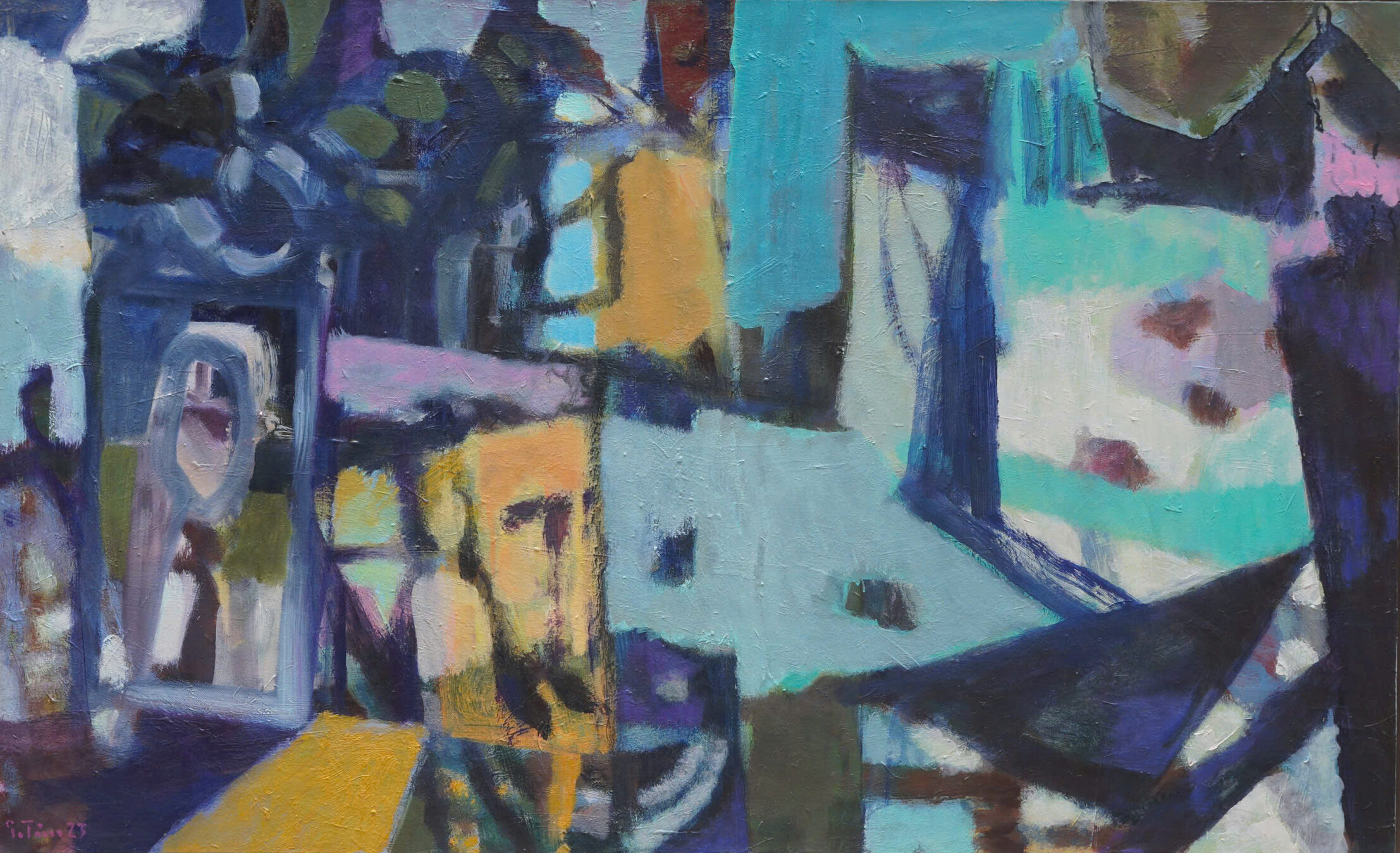 “Chợ Đầu Làng” sáng tác năm 2023, được khắc họa bằng ngôn ngữ trừu tượng, nơi các mảng màu xanh, tím, vàng và trắng giao thoa, gợi lên hình ảnh nhộn nhịp nhưng xa vắng của một khu chợ ven đô. Những đường nét góc cạnh và khối màu chồng lớp tạo cảm giác quen thuộc và xa xăm, như ký ức về làng nghề ngoại thành Hà Nội qua nhiều thế hệ. Bóng dáng con người, mái chợ, lối đi dường như chỉ còn lại trong những mảng màu, phản chiếu sự chuyển mình của đời sống: từ nhịp chợ xưa bình dị sang hiện thực đô thị đang lấn dần. “Chợ đầu làng” không đơn thuần miêu tả cảnh quan, mà mở ra chiều sâu ký ức và câu hỏi về giá trị văn hóa truyền thống trong dòng chảy đổi thay.
