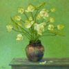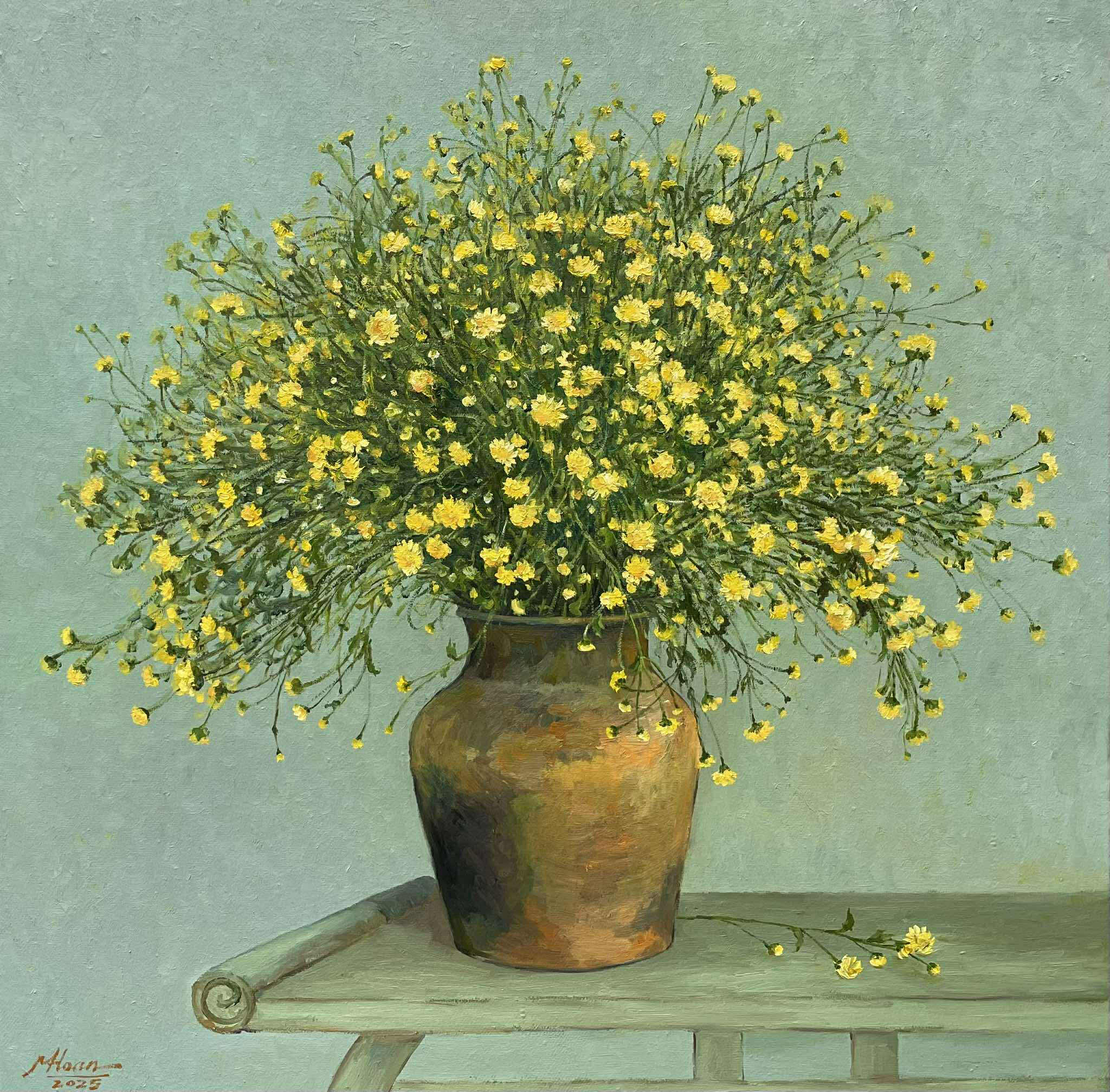 “Cúc Chi” sáng tác năm 2025 nhẹ nhàng tỏa sáng, từng nhành hoa vàng nhỏ bé bung nở trong chiếc bình gốm mộc mạc, đặt trên chiếc bàn gỗ giản dị. Kỹ thuật vẽ tinh tế với những lớp màu trong trẻo làm nổi bật sự mong manh mà đầy sức sống. Hình ảnh ấy khẽ gợi nhắc rằng vẻ đẹp không nằm ở sự rực rỡ phô trương, mà ở sự khiêm nhường, thanh sạch và niềm vui lặng lẽ nở ra từ những điều bình dị nhất.