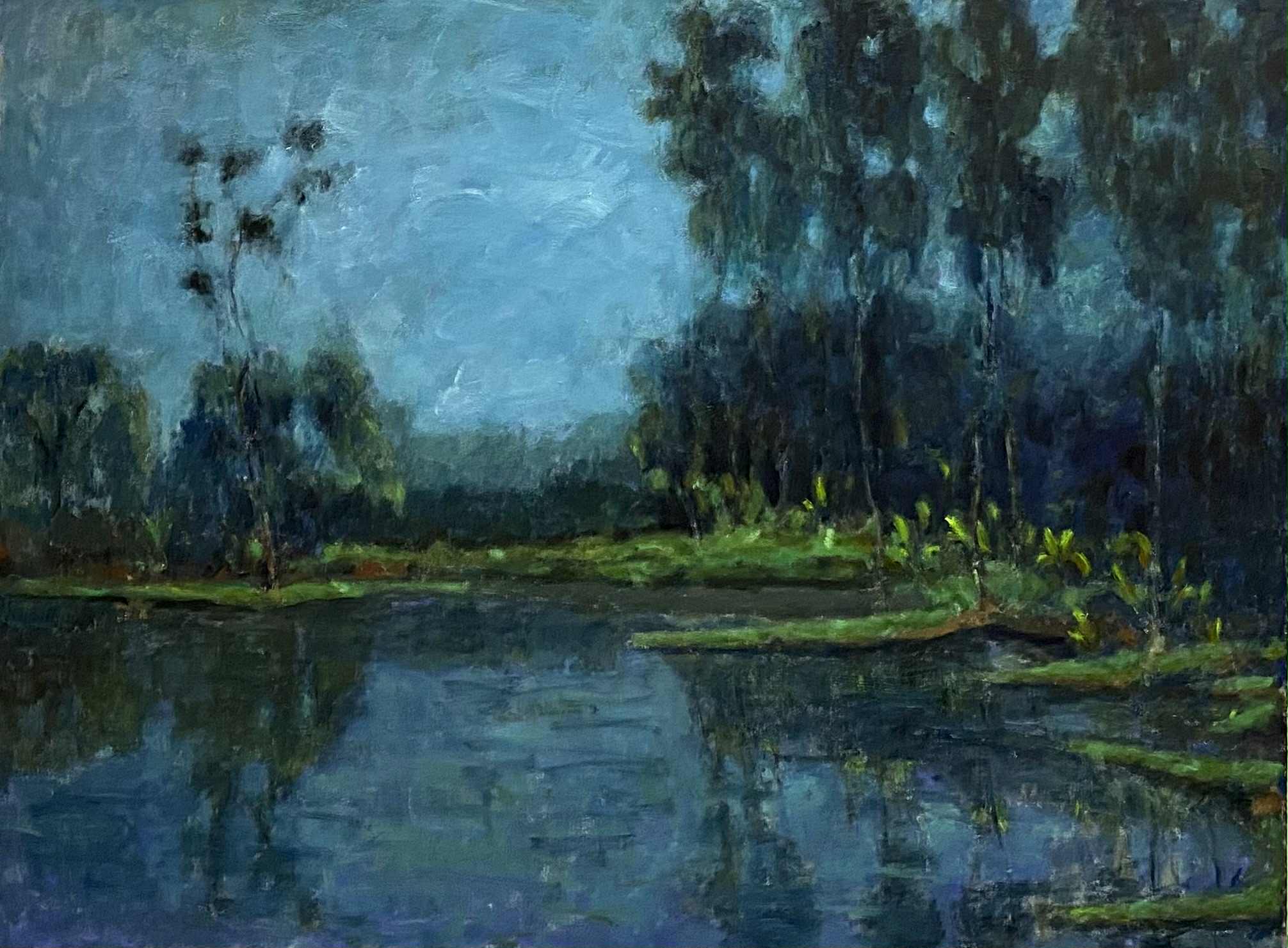 “Đêm Trăng” sáng tác năm 2024 mở ra khoảng lặng tĩnh mịch nơi mặt hồ phản chiếu sắc xanh thẳm, hàng cây in bóng lung linh trong ánh sáng dìu dịu. Những lớp màu xanh lam đậm nhạt được đan cài khéo léo, tạo nên cảm giác vừa huyền ảo, vừa gần gũi. Tác phẩm gợi nhắc đến sự an nhiên trong tâm hồn: khi màn đêm buông xuống, mọi náo nhiệt dừng lại, chỉ còn sự tĩnh tại để ta lắng nghe nhịp thở của đất trời và chính mình.