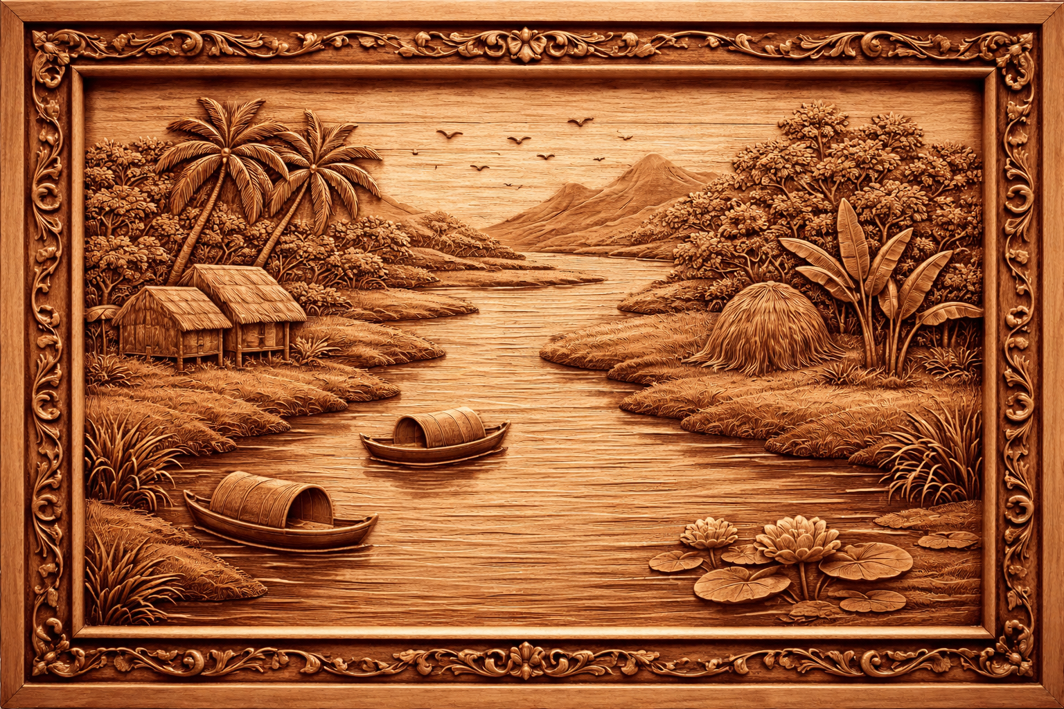 Bức tranh gỗ khắc họa khung cảnh làng quê thanh bình bên dòng sông uốn lượn. Trên mặt nước êm đềm, những chiếc thuyền nhỏ lặng lẽ trôi, gợi lên nhịp sống chậm rãi của miền quê. Hai bên bờ là những mái nhà tranh mộc mạc, hàng dừa nghiêng bóng và những bụi cây xanh tốt tạo nên cảm giác gần gũi, thân thuộc. Xa xa là dãy núi trập trùng cùng đàn chim bay ngang bầu trời, mang đến chiều sâu và sự khoáng đạt cho toàn bộ tác phẩm. Các chi tiết được chạm khắc tinh xảo trên nền gỗ tự nhiên, làm nổi bật vẻ đẹp mộc mạc nhưng đầy nghệ thuật. Bức tranh mang lại cảm giác yên bình, hoài niệm và rất phù hợp để trang trí không gian sống.