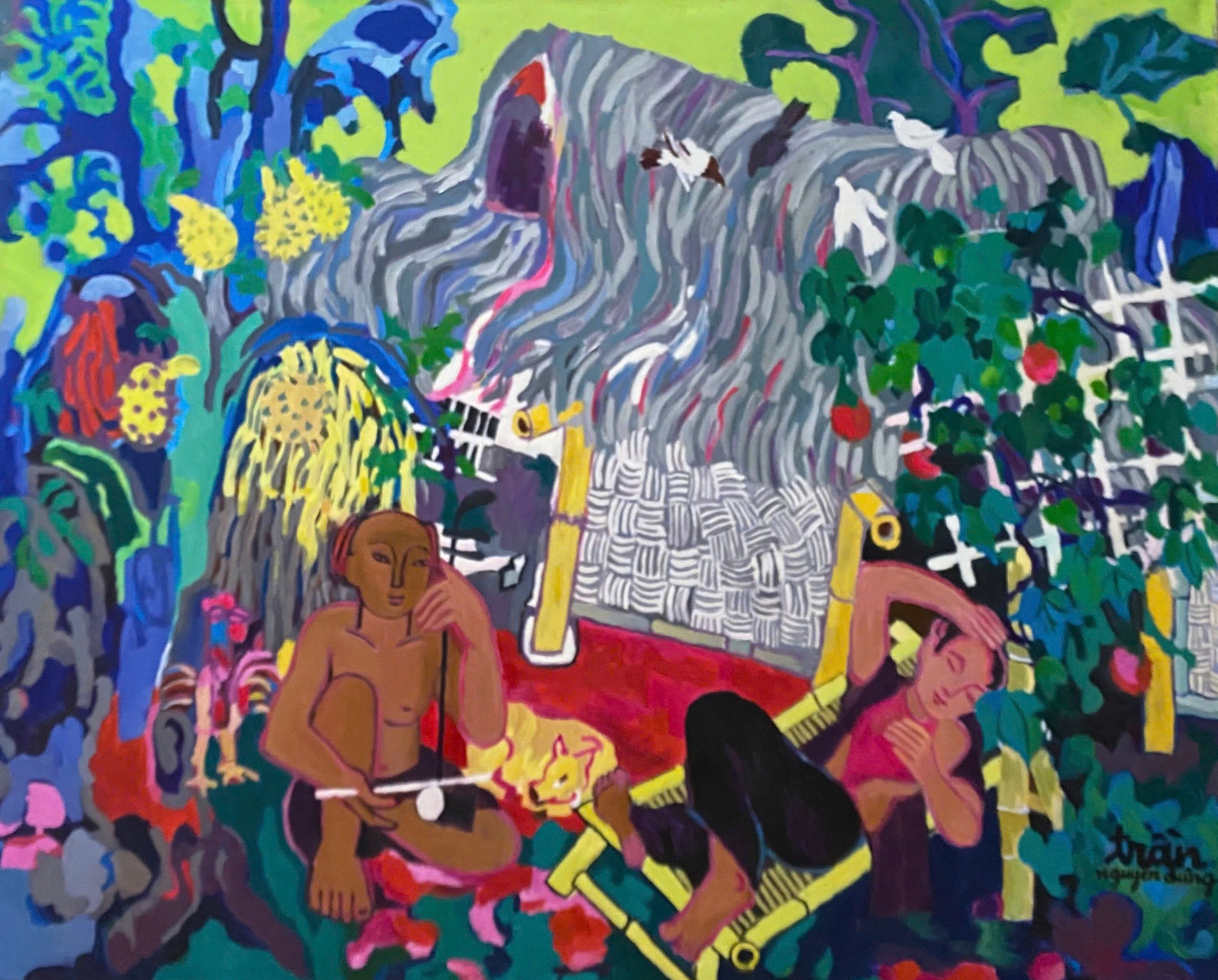 “Dưới Mái Rừng” dựng nên một không gian bản địa vừa thực vừa mộng, nơi con người và thiên nhiên hòa vào cùng một nhịp thở. Mái nhà tranh nghiêng như một sinh thể sống, các mảng màu chuyển động liên tục gợi cảm giác rừng đang thì thầm. Hai nhân vật ngồi trong trạng thái nghỉ ngơi, trầm tư, như lắng nghe tiếng đất và tiếng lửa. Cảnh sinh hoạt không kể chuyện cụ thể, mà gợi một đời sống nguyên sơ – nơi con người tồn tại chậm rãi, gần gũi với tự nhiên và chính mình.