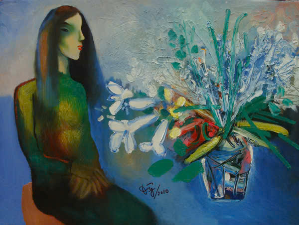 “Enjoying flowers” sáng tác năm 2010, là khoảnh khắc tĩnh lặng giữa con người và vẻ đẹp mong manh của tự nhiên. Người phụ nữ ngồi cạnh lọ hoa, không nhìn trực tiếp, nhưng dường như tâm trí đang hòa cùng hương sắc. Những cánh hoa bung nở rực rỡ trong khi gương mặt cô lại trầm tư, gợi nên sự đối lập giữa chuyển động của sự sống và sự tĩnh tại của tâm hồn. Màu xanh lam bao trùm không gian, làm dịu đi những mảng đỏ và vàng rực rỡ, như lời thì thầm về một niềm an nhiên kín đáo, nơi cái đẹp không cần phô diễn mà tự khắc lan tỏa.