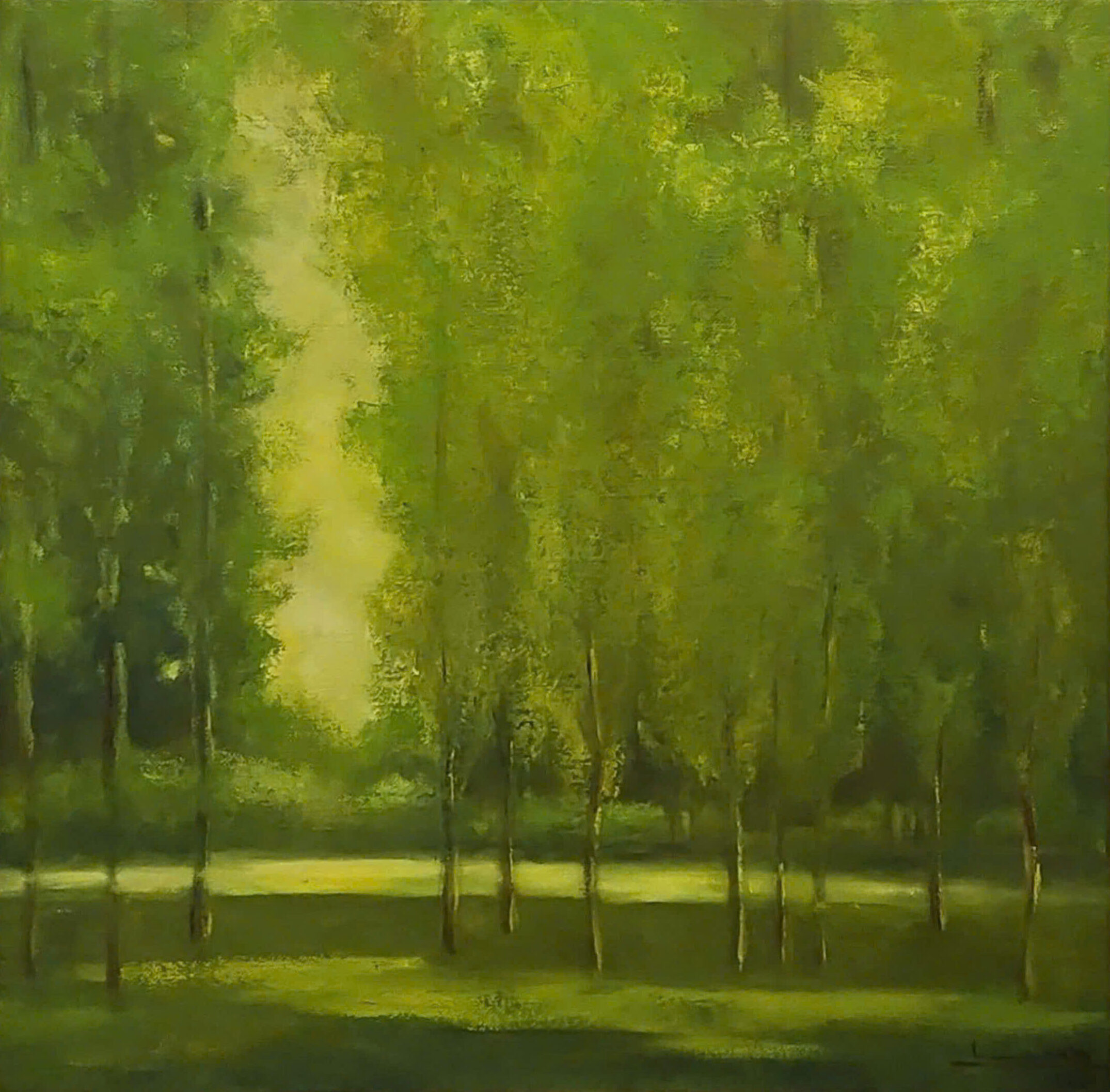 “Forest Symphony” sáng tác năm 2021 là một khúc thiền ca của rừng. Những thân cây mảnh như hơi thở, hòa vào sắc xanh bảng lảng của sương và ánh sáng. Không có chuyển động, chỉ có nhịp thở của tĩnh lặng, nơi màu xanh lan tỏa như một bản nhạc vô thanh. Ánh sáng rẽ qua tán lá, mở ra con đường nội tâm, nơi tâm và cảnh hòa làm một. Không diễn tả, không lời, chỉ là sự lắng đọng của thiên nhiên khi trở về với chính mình.