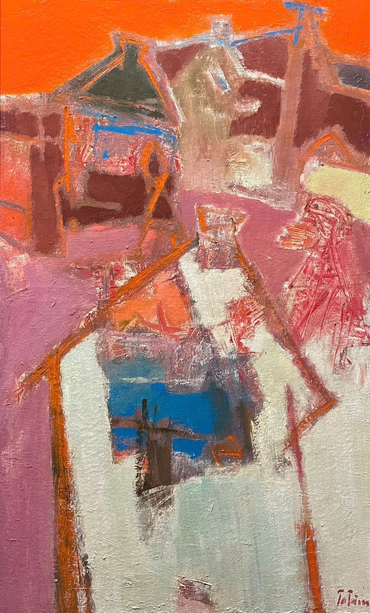 “Giao Mùa 1” sáng tác năm…, mở ra khung cảnh phố phường cũ với sắc độ cam, hồng, tím và mảng trắng đối chọi, như tiếng vọng của những mái ngói rêu phong đang dần nhòa đi trong nhịp đô thị mới. Các khối màu được vẽ theo lối bán trừu tượng, gợi hình dáng ngôi nhà, phố xá, và hòa tan vào cảm xúc nội tâm. “Giao mùa” ở đây không chỉ là thời tiết, mà là sự dịch chuyển tinh tế giữa quá khứ và hiện tại, nơi cái cũ chưa kịp phai mờ, cái mới đã len vào. Bức tranh trở thành bản đối thoại lặng lẽ về ký ức và đổi thay, về cách con người giữ lại căn tính văn hóa trong vòng xoay hiện đại.
