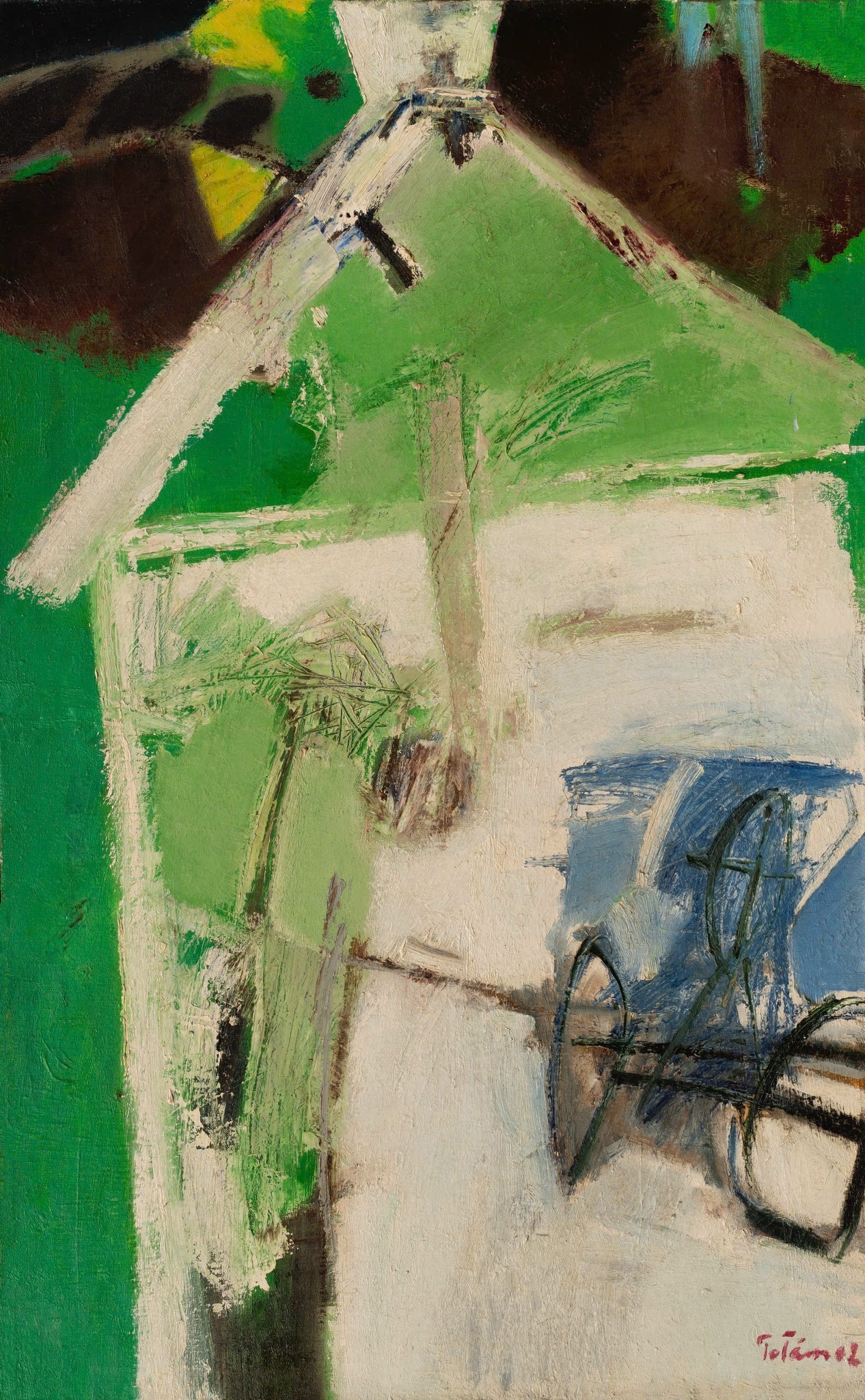 “Giao Mùa 2” sáng tác năm…, mở ra không gian phủ đầy gam xanh trắng, điểm xuyết chút vàng cam, tạo cảm giác tươi sáng mà hoài niệm. Các mảng màu bán trừu tượng gợi hình bóng ngôi nhà, con đường và chiếc xe thô mộc, như ký ức làng quê hiện lên giữa đô thị hóa. “Giao mùa” ở đây không phải thời tiết, mà là khoảnh khắc giao thoa tinh tế giữa quá khứ và hiện tại. Bức tranh trở thành lời nhắc nhở dịu dàng về căn tính văn hóa trong vòng xoay đổi thay.