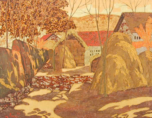 “Golden sunlight” sáng tác năm 2005, là khúc ca rực rỡ của miền quê trong buổi nắng hanh vàng. Ánh sáng như tràn qua mọi ngóc ngách, phủ lên mái ngói, tường đá và những ụ rơm hình tròn thứ sắc vàng óng, vừa thực, vừa như mơ. Mỗi chi tiết đều thấm đẫm cảm xúc của người họa sĩ dành cho làng cũ: giản dị nhưng đầy sức sống. Trong không gian ấy, thời gian dường như ngưng đọng, chỉ còn lại hơi ấm của mặt trời và nhịp thở yên bình của đất, thứ “ánh sáng ký ức” mà ta luôn muốn níu lại.