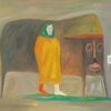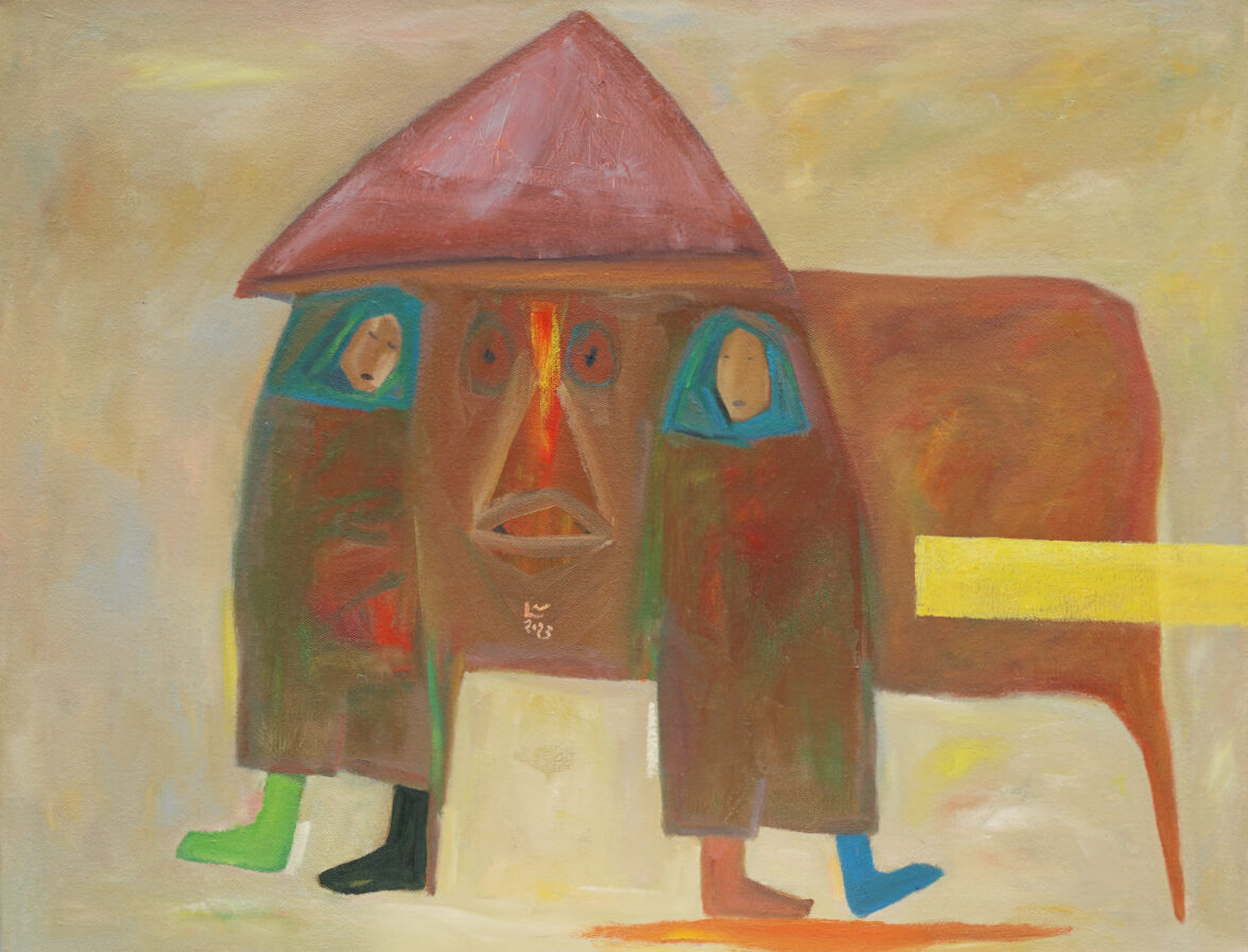 “Hai Người Đàn Bà Và Bò” sáng tác năm 2023, khắc họa thân phận người phụ nữ nông thôn trong sự gắn bó âm thầm với lao động và con vật nuôi. Hình khối được giản lược thành mặt phẳng, gương mặt hòa lẫn vào hình thể con bò, tạo cảm giác con người và gia súc cùng chia sẻ một số phận. Sắc nâu, đỏ, xanh gợi lên sự nặng nhọc, bền bỉ nhưng cũng ẩn chứa tính biểu tượng. Tác phẩm không chỉ kể câu chuyện đời sống mà còn trở thành hình ảnh tượng trưng cho sự đồng hiện giữa người đàn bà quê và vòng quay mưu sinh.