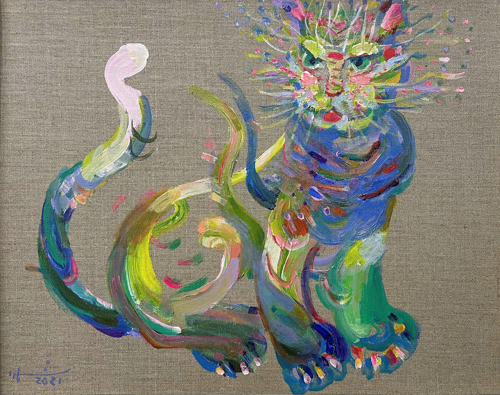 “Hổ Nhâm Dần” sáng tác năm 2021 là một vũ điệu của màu sắc và xúc cảm về hình tượng linh vật dân gian. Không tập trung vào vẻ uy nghi, tác phẩm lại chọn cách thể hiện một tinh thần phóng khoáng thông qua những nhát cọ rực rỡ và đầy năng lượng. Trung tâm bố cục là hình ảnh chú hổ với hai tông màu đối lập: xanh thẫm và hồng pastel đan xen, tạo nên một sự tương phản thị giác mạnh mẽ. Tác phẩm gợi ra thông điệp rõ ràng về vẻ đẹp vô thường và sự giao thoa giữa con người và thiên nhiên, khi hình thể và màu sắc đều chỉ tồn tại trong khoảnh khắc. Chính sự kết hợp giữa nét cọ dứt khoát và mảng màu loang tạo nên một chiều sâu cảm xúc, lưu giữ trọn vẹn sức mạnh tiềm ẩn của loài chúa sơn lâm.