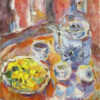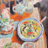 “Hoa Huệ Tây” sáng tác năm 2024, khắc họa những đóa Huệ Tây rực rỡ, bung nở trong chiếc bình gốm nâu mộc mạc, đặt trên nền khăn họa tiết đầy sắc màu. Nét cọ dày, khỏe và thoáng, kết hợp gam đỏ, hồng, cam chan hòa tạo nên cảm giác tươi mới, tràn đầy sức sống. Như một lời nhắn gửi dịu dàng về việc hãy mở lòng đón nhận sự đổi thay, bởi trong từng khoảnh khắc giao mùa luôn có vẻ đẹp của hồi sinh và hy vọng.