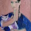 “Hoa Tú Cầu” sáng tác năm 2023, tái hiện bình hoa xanh lục ôm trọn chùm cánh nhỏ li ti, sắc tím hồng chen lẫn xanh trắng, lan tỏa trên nền tím trầm đầy sâu lắng. Bằng sơn dầu đắp dày, những nhát cọ bản rộng hòa cùng chấm màu ngẫu hứng, tạo nên nhịp điệu rực rỡ và an nhiên. Giữa lớp màu xoáy động là lời thì thầm của tú cầu: hãy biết ơn, hãy gắn kết và để lòng mình dịu lại, để nơi ở trở thành chốn chan chứa ấm áp và yêu thương.