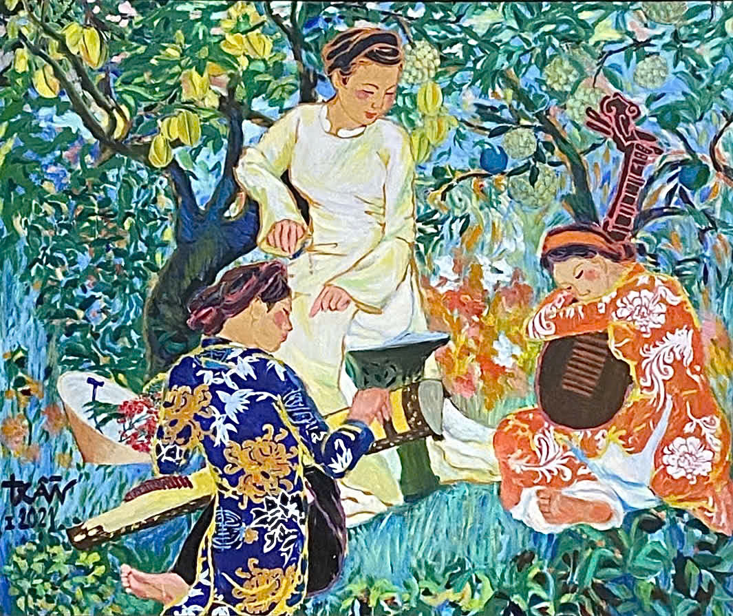 “Khoảng Lặng Mùa Quả” gợi lên một nhịp sống chậm, nơi con người không còn vội vã mà lắng mình giữa thiên nhiên. Ba dáng hình quây quần, mỗi người một cử chỉ riêng, tạo nên đối thoại thầm lặng đầy nữ tính. Sắc màu rực rỡ nhưng được tiết chế khéo léo, khiến khung cảnh như vừa chín tới, không chỉ của trái cây, mà còn của cảm xúc và những ký ức dịu dàng, sâu kín.