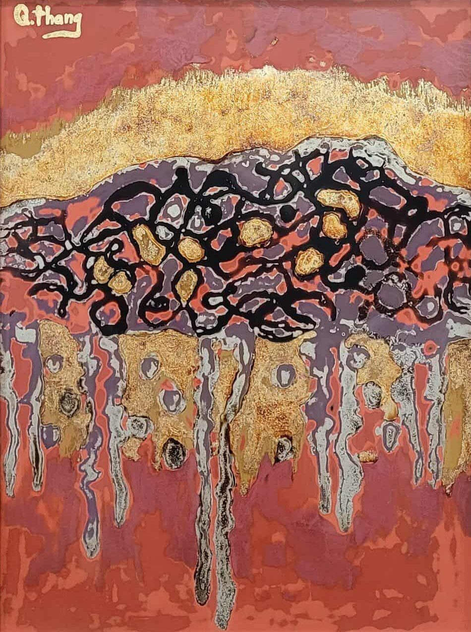 “Không Gian 5” gây ấn tượng mạnh bởi cấu trúc thị giác giàu tương phản. Những lớp vàng rực phía trên như một nguồn sáng, trong khi các mảng đen và đỏ phía dưới tạo nên cảm giác về sự chuyển động và biến đổi của vật chất. Các dòng chảy kéo dài xuống dưới gợi liên tưởng đến thời gian đang tan chảy qua từng lớp không gian. Với bề mặt chất liệu dày và nhịp điệu tạo hình mạnh mẽ, tác phẩm mở ra một thế giới trừu tượng nơi năng lượng, ký ức và cảm xúc hòa quyện trong một trạng thái dữ dội mà lại trầm lắng.