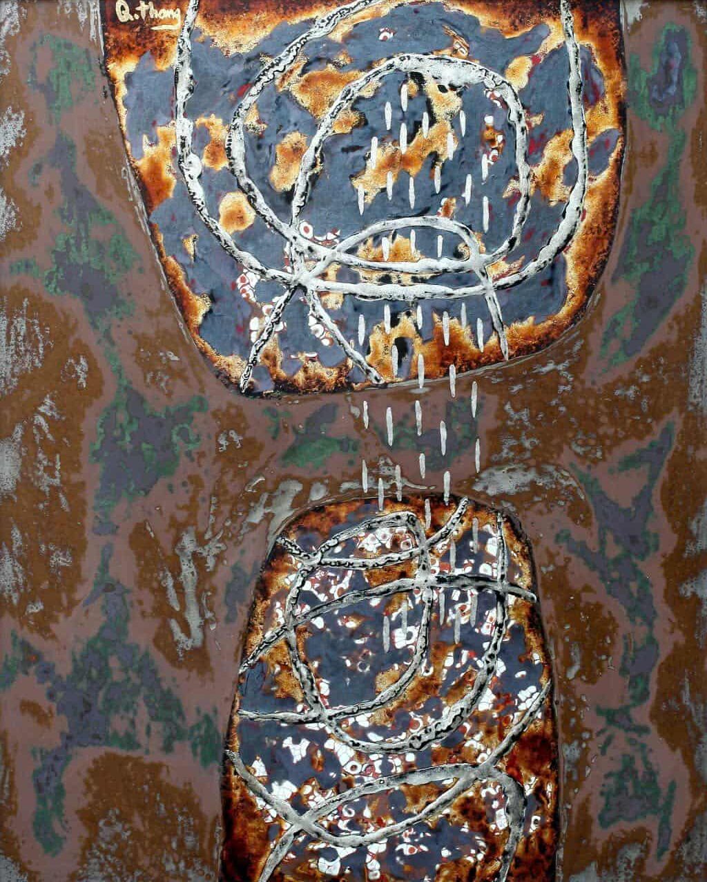 “Không Gian 7” mở ra một cấu trúc thị giác như hai tầng không gian đang đối thoại với nhau. Những đường nét trắng đan cài, vừa giống mạch chảy tự nhiên vừa như những dấu vết của chuyển động nội tâm, kết nối hai khối hình trên dưới bằng một nhịp rơi lặng lẽ. Bảng màu nâu, xám và những vệt cháy gợi cảm giác về sự bào mòn của thời gian, như bề mặt của ký ức đã trải qua nhiều lớp biến đổi. Trong bố cục ấy, các hình thể không cố định mà dường như đang sinh ra, tan ra rồi lại tái cấu trúc. Tác phẩm vì thế không chỉ là một “không gian” để nhìn, nó còn là một trường cảm xúc để người xem có thể cảm nhận sự chuyển động âm thầm của thời gian, vật chất và những tầng sâu của tâm tưởng.