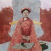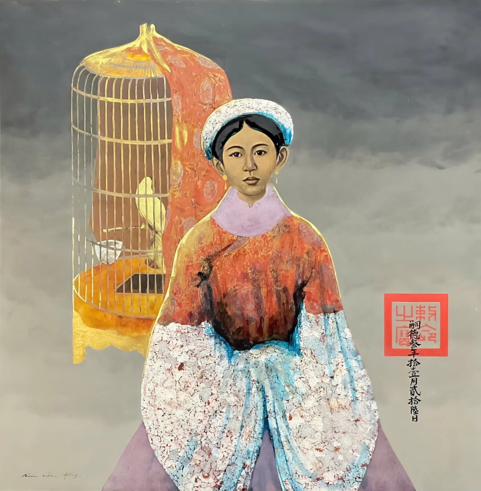 “Mandarin’s wife” sáng tác năm 2020, là hình ảnh người phụ nữ gánh trong mình hai thế giới: rực rỡ bên ngoài và tĩnh lặng bên trong. Tà áo cung đình với gam đỏ son pha lam tím được khắc họa bằng kỹ thuật sơn mài cổ điển, đối lập với chiếc lồng chim phía sau, biểu tượng của sự giam cầm lặng lẽ. Ánh mắt người đàn bà không buồn, chỉ sâu – như một nỗi thức nhận. Họa sĩ tái hiện vẻ đẹp nữ giới Việt Nam trong xã hội phong kiến với sự cảm thông và tinh tế, nơi quyền lực, tình yêu và cô độc hòa vào nhau trong một lớp sơn óng ánh thời gian.