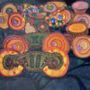 “Miền thương nhớ” sáng tác năm 2024, đưa người xem trở lại tuổi thơ của họa sĩ bên ao cá giống nơi miền quê Bắc Bộ. Trên nền xanh gợi tre làng và mặt nước lóng lánh, hình ảnh người nông dân cần mẫn nuôi cá hiện lên sống động, vừa bình dị vừa chan chứa tình cảm, gợi nhịp sống êm đềm mà đậm đà ký ức.