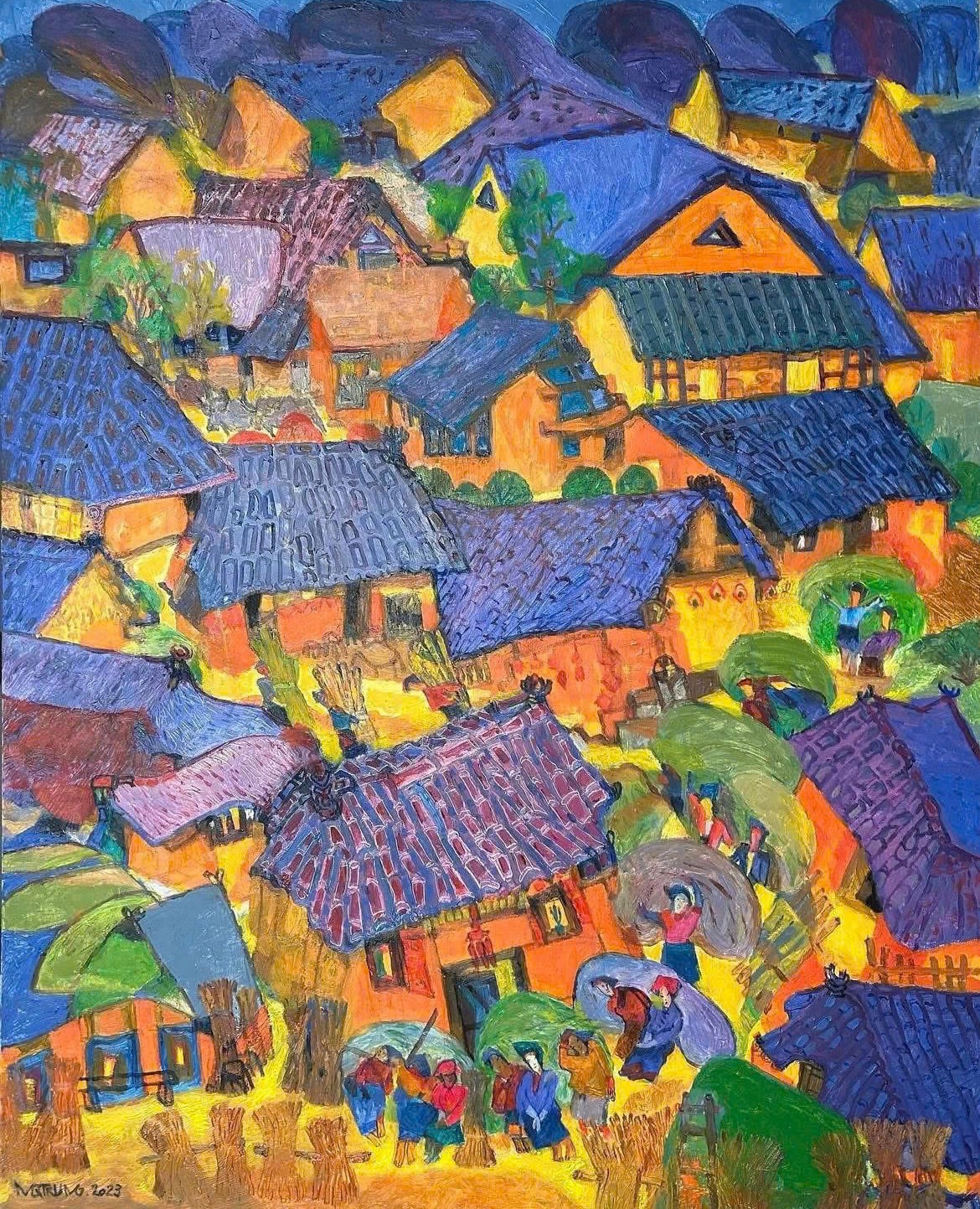“Miền Việt Bắc” sáng tác năm 2023, đưa ta về bản làng H’Mông bình dị, nơi nhịp sống thường nhật chan chứa sự gắn kết và ấm áp tình người. Trong gam màu gần gũi, cảnh sinh hoạt lao động hiện thực hiện lên sống động, gợi niềm thương mến với đời sống miền sơn cước. Tác phẩm như vòng tay nâng niu ký ức, khơi dậy cảm xúc gắn bó, thôi thúc ta trân trọng và gìn giữ giá trị văn hóa.