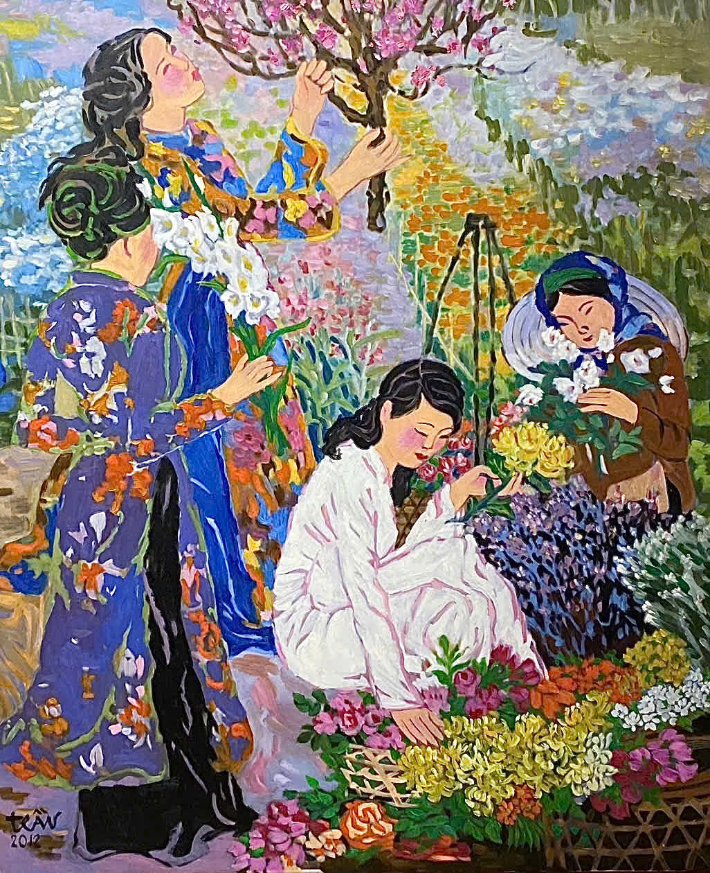 “Mùa Hoa” khắc họa một khu vườn ngập tràn sắc nở, nơi những người phụ nữ lặng lẽ chăm chút từng nhành hoa. Mỗi cử chỉ đều chậm rãi, mềm mại, như hòa vào nhịp thở của thiên nhiên. Bảng màu phong phú nhưng được điều tiết tinh tế, tạo nên cảm giác êm đềm, sâu lắng. Tác phẩm gợi về vẻ đẹp nữ tính bền bỉ dịu dàng, kiên nhẫn và lặng thầm nuôi dưỡng những giá trị sống qua từng mùa nở rộ.