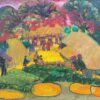 “Mùa Xuân Sắp Về” sáng tác năm 2002, mở ra một thế giới đầy âm thanh và ánh sáng của ngày hội quê. Những mái ngói đỏ cong vồng, những khối nhà xanh, vàng, tím giao nhau như một bản nhạc rộn ràng. Tất cả được giản lược thành những mảng màu lớn, tươi tắn, giàu tiết tấu, thể hiện tinh thần biểu hiện, trừu tượng hóa hình khối. Dưới cổng làng, dòng người rộn ràng đón Tết, mang theo sức sống, niềm vui và sự sum vầy. “Mùa xuân sắp về” là lời ca ngợi sự hân hoan của con người Việt, nơi màu sắc trở thành linh hồn của ký ức và hy vọng.