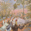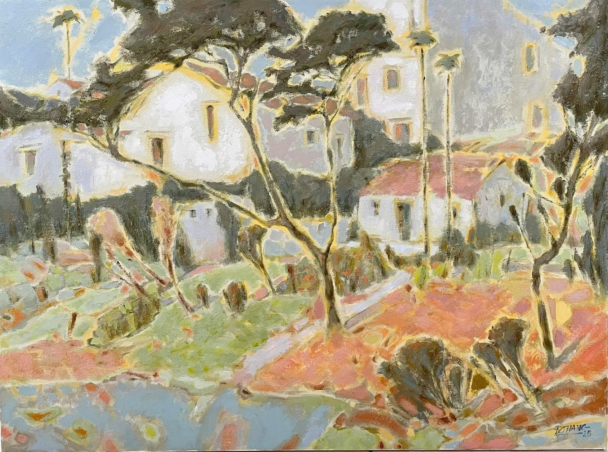“Ngày Mới” sáng tác năm 2025, mở ra một không gian yên bình với mái nhà nhỏ nép dưới bóng cây, những gam màu nhạt bảng lảng như hơi sương núi rừng. Bút pháp nhẹ nhàng, giản lược chi tiết nhưng vẫn đủ gợi nên nhịp sống thôn quê thanh thản. “Khúc ca làng cũ” không chỉ ghi lại một cảnh quan, mà còn lưu giữ ký ức về sự gắn bó con người và thiên nhiên, nơi vẻ đẹp bình dị trở thành điểm tựa tinh thần trong vòng xoay đổi thay của thời cuộc.