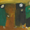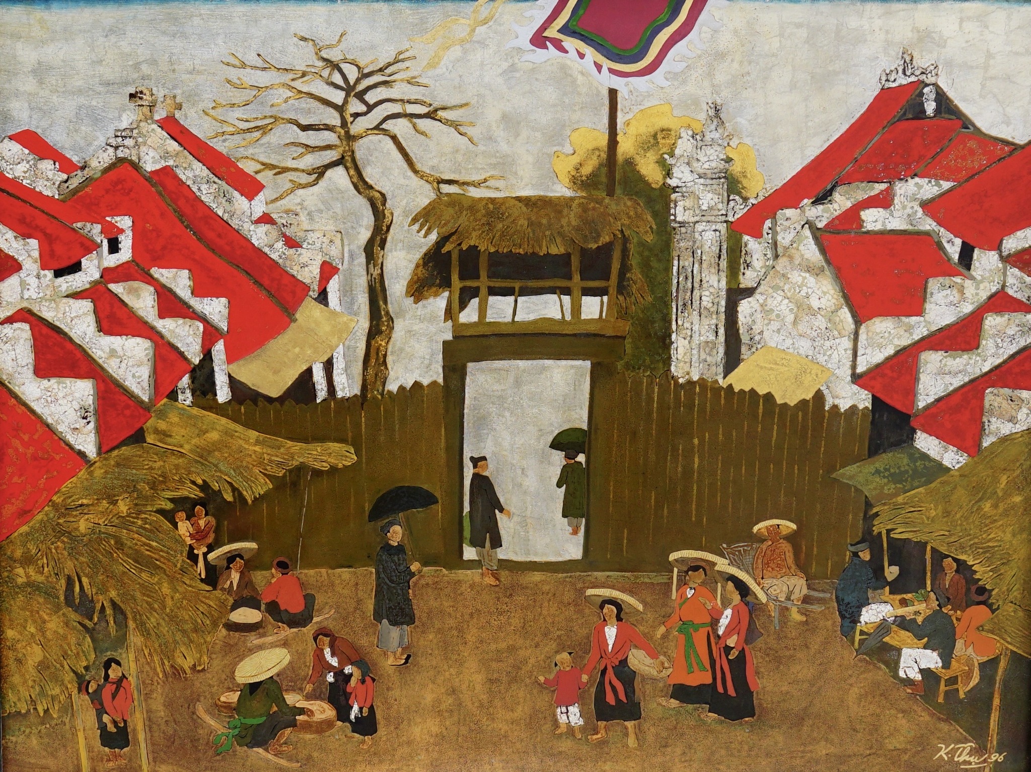 “Cổng Phường Xưa” sáng tác năm 1996, tái hiện cảnh sinh hoạt của người Hà Nội thế kỷ XIX, nơi cổng phường trở thành điểm tụ họp cộng đồng. Trên nền mái ngói đỏ thắm của đền chùa, người dân quây quần buôn bán, trẻ nhỏ vui đùa, phụ nữ trong y phục truyền thống cùng nhau đi lễ đầu xuân. Bút pháp sơn mài với gam màu nâu, đỏ, vàng trầm ấm, giàu nhịp điệu tạo nên bầu không khí rộn ràng và trang nghiêm. Hình ảnh ấy không chỉ gợi lại nét văn hoá Tết và tín ngưỡng xưa, mà còn là dấu ấn về sự gắn kết của làng xã, nơi cổng phường trở thành biểu tượng cho đời sống cộng đồng và tinh thần truyền thống bền chặt.