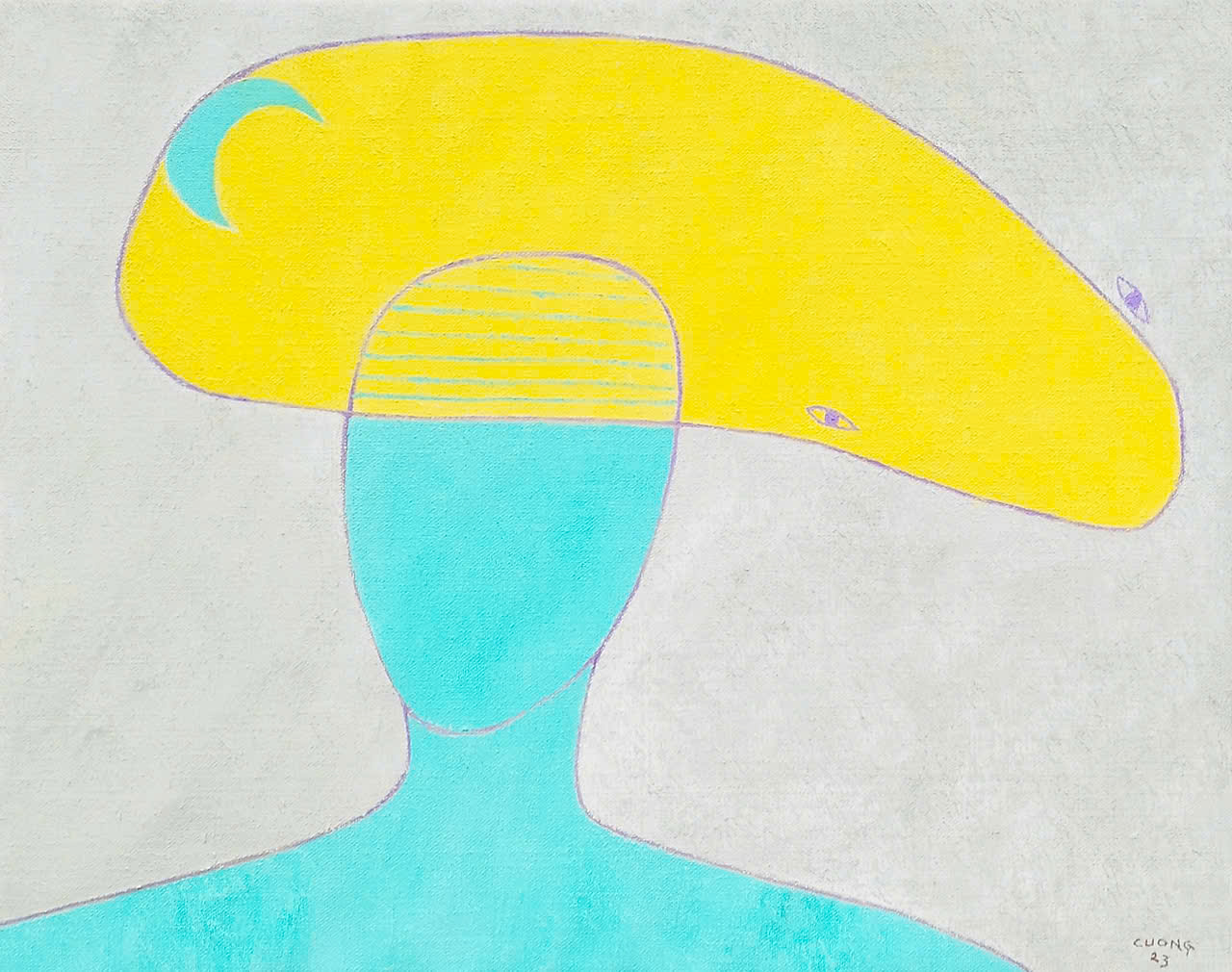 “Peaceful moment” sáng tác năm 2023, như một nốt nhạc yên lành vang lên giữa khoảng trống. Sự tối giản hình thể và màu sắc tinh khiết: xanh, vàng, trắng, mang đến cảm giác thanh lọc tuyệt đối. Cấu trúc gợi dáng người trong thiền định, nhưng chiếc “vầng mây” vàng trên đầu lại như tâm tưởng đang mở ra, lơ lửng giữa mộng và thực. Ánh trăng cong khẽ trên đó là nhịp thở của tĩnh lặng. Tất cả tan vào nhau, không ranh giới giữa con người và không gian, chỉ còn lại cảm giác của sự an nhiên, nơi tâm trí trở nên trong suốt như ánh sáng.