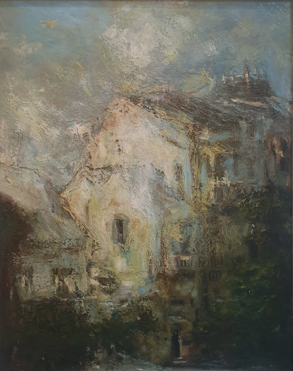 “Phố” sáng tác năm…, mở ra khung cảnh của một góc nhà cổ rêu phong, ẩn hiện trong lớp màu dày trầm mặc. Những mảng sáng tối chồng lấp, như hơi thở của thời gian phủ lên kiến trúc cũ, khiến phố phường trở thành nơi lưu giữ ký ức nhiều hơn là nơi chảy trôi hiện tại. Gam nâu, vàng xám và xanh sẫm hòa quyện, gợi cảm giác vừa ấm áp vừa u tịch. “Phố” như một khúc trầm ngân, nơi người xem bắt gặp bóng dáng quá khứ len trong từng vệt màu, từng khối nhà ngả nghiêng dưới ánh sáng mờ ảo.