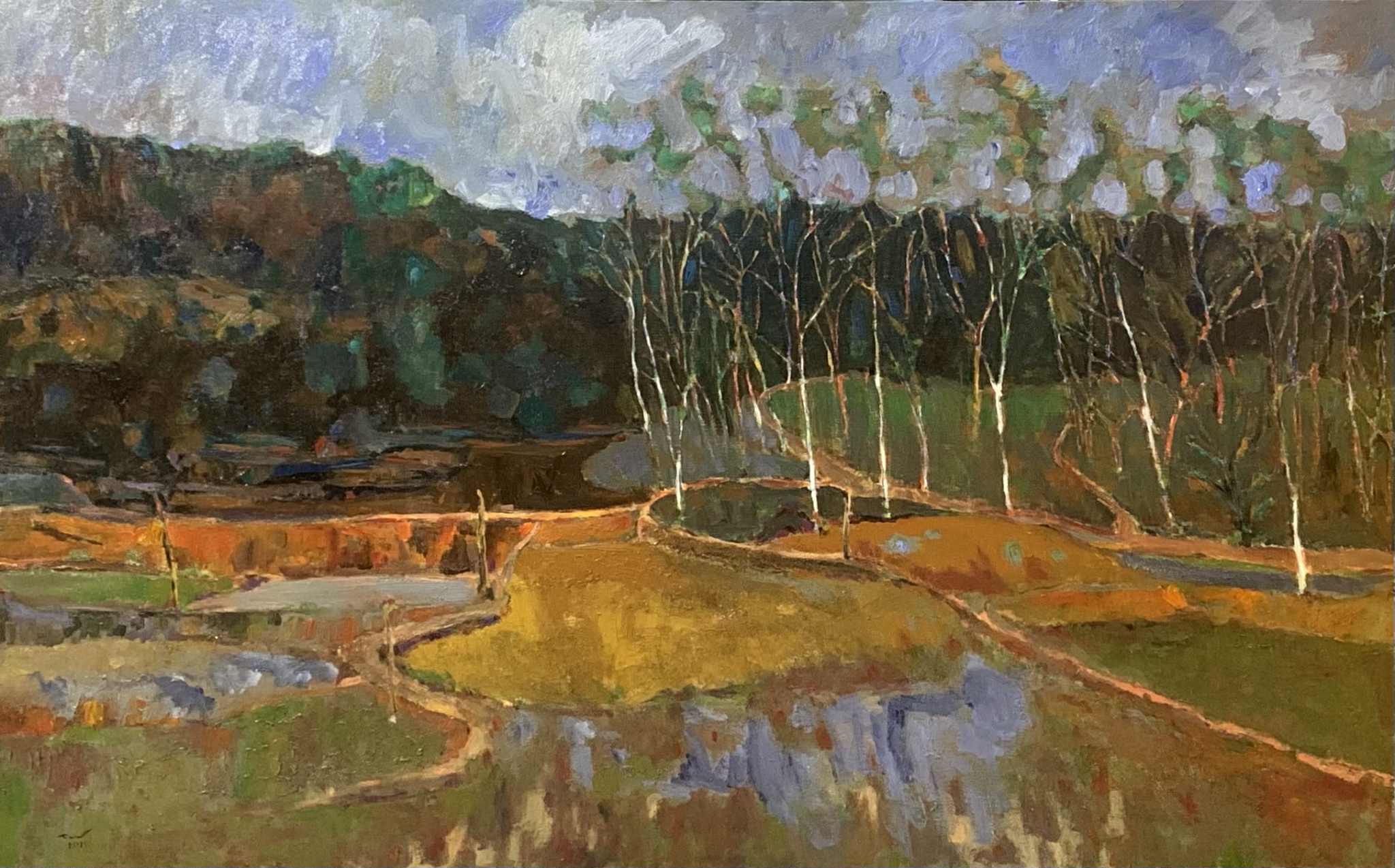 “Phong Cảnh Phú Thọ” sáng tác năm 2021 mở ra dáng vẻ trung du với ruộng bậc loang ánh nước, rặng cây gầy khẳng khiu in bóng dưới trời mây bảng lảng. Họa sĩ sử dụng lớp màu trầm ấm, đan cài sáng tối, để cảnh vật vừa gần gũi, vừa mang nét trữ tình sâu lắng. Phong Cảnh Phú Thọ không chỉ ghi lại vẻ đẹp quê hương, mà còn nhắc nhở về sự bền bỉ, lặng lẽ của đất trời nuôi dưỡng tâm hồn con người.