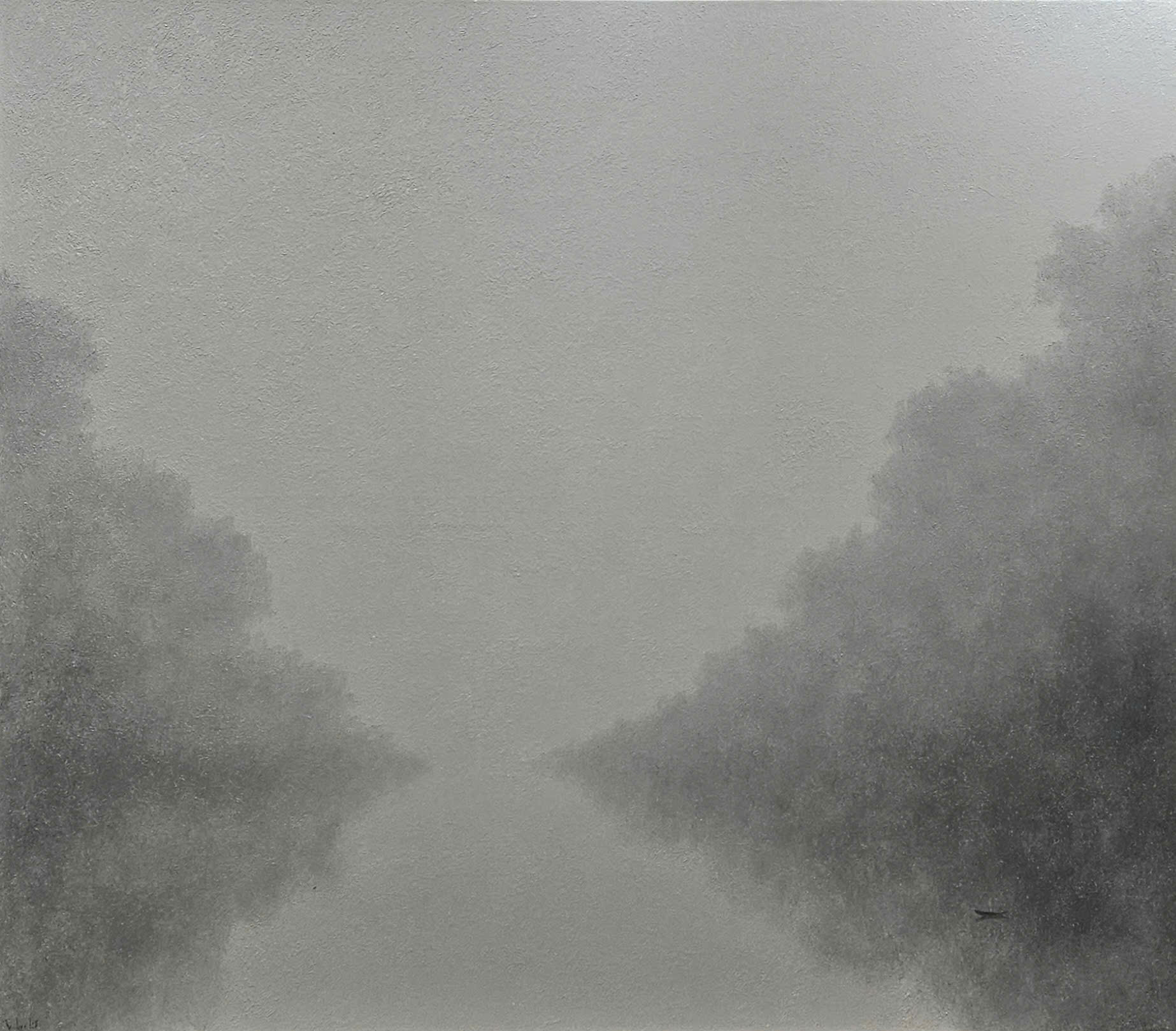 “Phong Cảnh” mở ra một khoảng không mờ sương, nơi ánh sáng như tan chảy vào từng lớp mây xám chờn vờn, tạo nên cảm giác huyền bí và tĩnh lặng. Sự vắng bóng chi tiết cụ thể làm cho không gian ấy trở thành biểu tượng của vô tận, một khoảng trời không điểm đầu và không kết thúc. Gam màu xám và ánh sáng bạc gợi nhắc đến sự mong manh của tồn tại, như thể vạn vật đều chỉ là thoáng qua trong dòng chảy bất tận của thời gian. Ẩn sâu sau lớp sương khói ấy không dừng lại ở việc khắc họa cảnh vật, mà còn mở ra một miền tâm tưởng, nơi con người tìm thấy sự tĩnh lặng, soi chiếu lại chính mình trong khoảnh khắc đối diện với hư vô và vĩnh cửu.