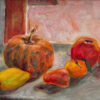 “Quà quê” sáng tác năm 2025, mang hơi thở dịu dàng với bình gốm cam chứa nhành lá xanh, bên cạnh ấm trà và tách nhỏ đơn sơ. Gam màu ấm phối xen kẽ những nét cọ tự do, dày và giàu nhịp điệu, khiến ánh sáng như lay động trên nền vải. Tranh gợi nhớ những buổi chiều yên bình, nơi một tách trà có thể gom đủ sự tĩnh lặng, để lòng người lắng lại giữa nhịp sống vội vàng.