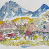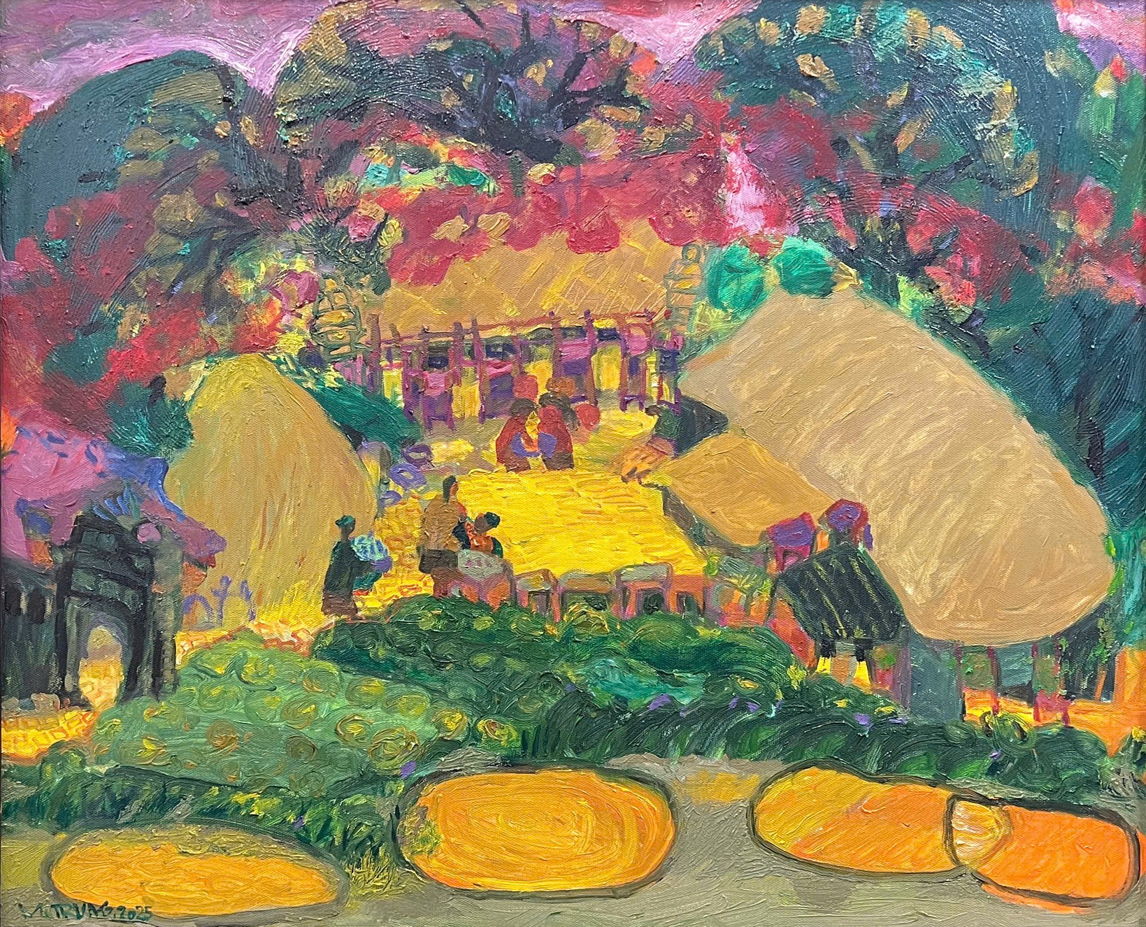 “Quê” sáng tác năm 2025, đưa ta trở về miền ký ức êm đềm, nơi màu vàng của rơm, mái tranh và ánh nắng hòa vào nhau thành hơi thở của mùa gặt. Trong bố cục chặt chẽ và rực rỡ, người họa sĩ khéo léo để màu sắc dẫn dắt cảm xúc: tím, hồng của tán cây gợi chiều muộn, vàng, xanh gợi sự sống và đủ đầy. “Quê” không miêu tả hiện thực, mà là một ký ức được chắt lọc qua xúc cảm, nơi sự mộc mạc trở thành vẻ đẹp thiêng liêng.