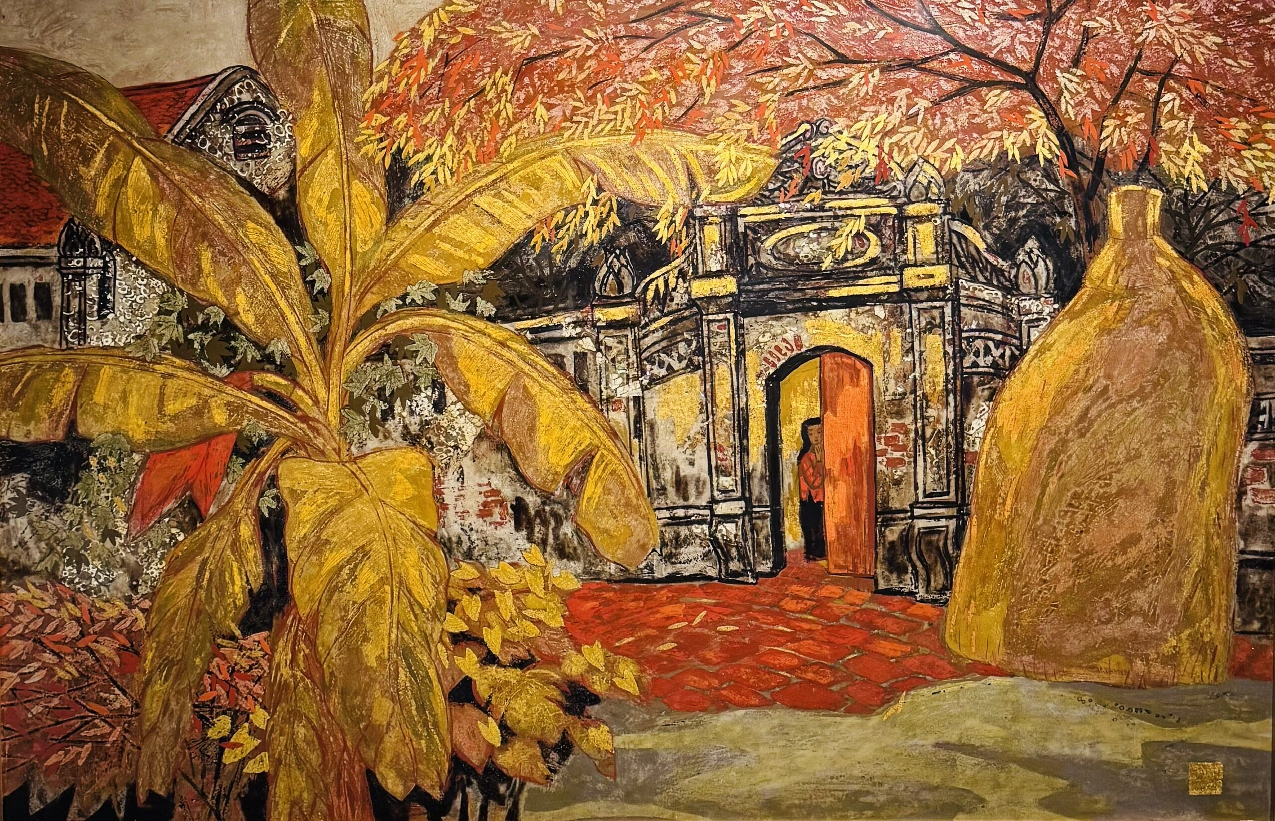 “Quê Ngoại” sáng tác năm 2024, là khung ký ức rực rỡ và thấm đẫm cảm xúc quê nhà. Màu vàng của lá chuối, màu gạch đỏ của sân và sắc vàng thẫm trên cổng làng hòa vào nhau trong nhịp điệu của ký ức và thời gian. Hình ảnh người phụ nữ thấp thoáng nơi ngưỡng cửa gợi cảm giác thân thương, như một điểm tựa tinh thần giữa mùa lá đổ. Bút pháp sơn mài được xử lý mạnh mẽ mà mềm mại, làm sống dậy cả hương đất, hơi nắng, và âm vang của tuổi thơ. Mọi chi tiết đều dẫn người xem trở về miền quê nơi tình thân và nỗi nhớ luôn neo đậu.