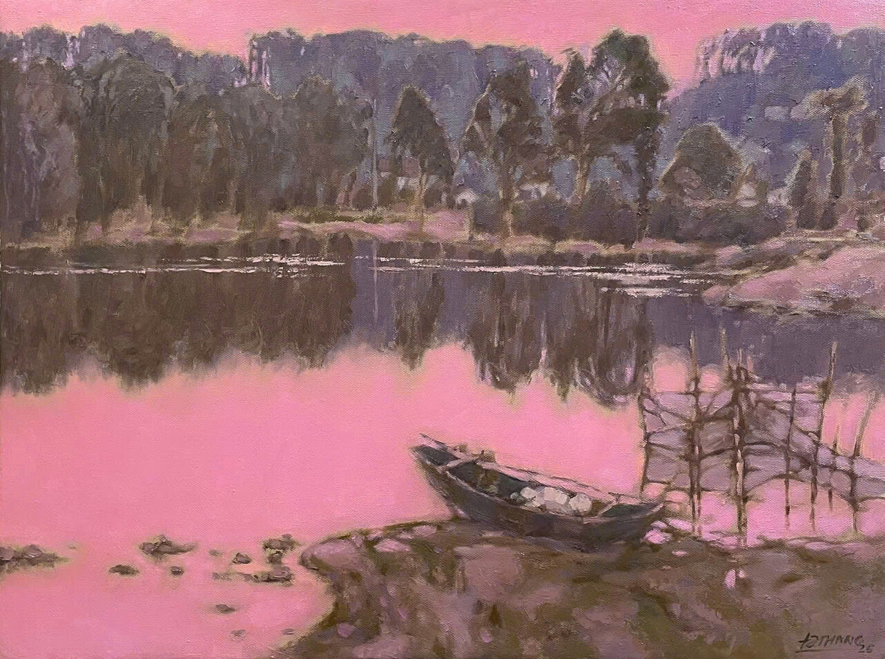 “Quê Tôi” sáng tác năm 2025, tái hiện mặt nước hồng tím dưới ánh hoàng hôn trong buổi chiều tà, được phản chiếu sau rặng cây tĩnh lặng, nơi một con thuyền nhỏ nằm yên bên bờ. Gam màu trầm lắng hòa cùng sắc hồng gợi cảm giác mơ hồ, vừa thực vừa hoài niệm. Dấu lặng nhẹ nhàng mà êm đềm ấy lưu giữ khoảnh khắc bình yên còn sót lại giữa quá trình đô thị hóa gấp gáp, như lời nhắc nhở trân trọng quê hương, nơi ký ức và tâm hồn luôn tìm về để lắng dịu.