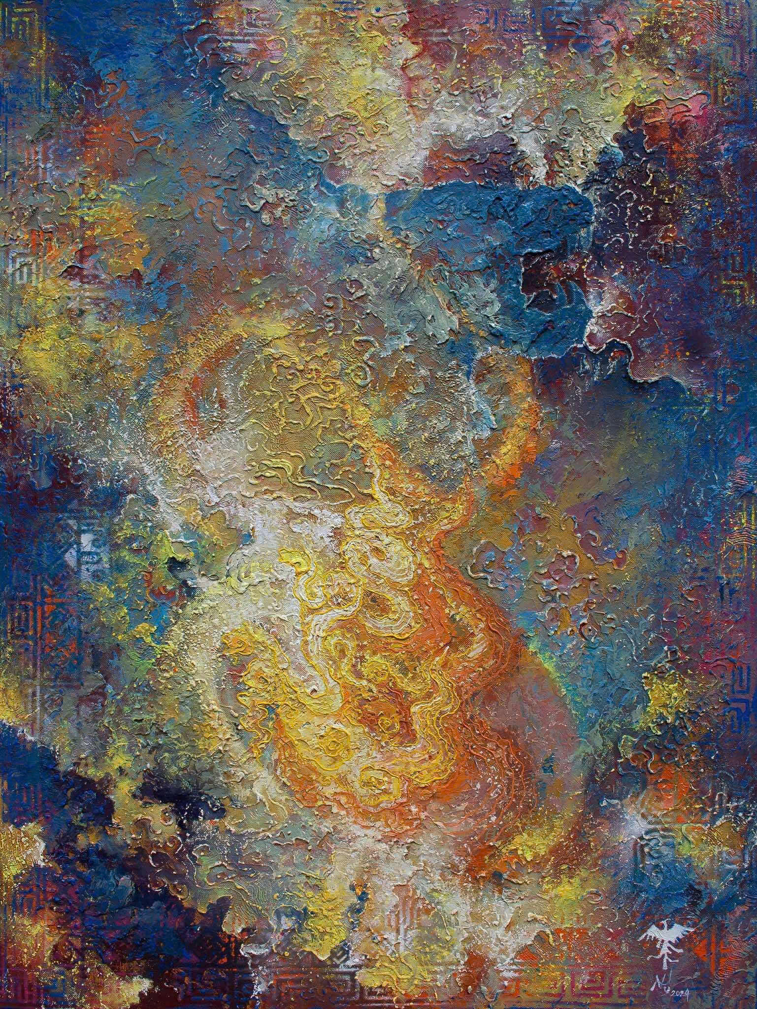 “Rồng Cắn Mình” sáng tác năm 2024 với hình ảnh linh thú không còn là biểu tượng của quyền uy hay sự siêu phàm, mà trở thành ẩn dụ đau đớn về một quyền lực tự làm tổn thương chính mình. Rồng – biểu trưng cho nhà vua – nay lại cắn vào thân thể mình, như sự giằng xé nội tâm của Lý Nhân Tông sau nỗi oan Lê Văn Thịnh. Gam vàng của đế quyền hòa với xám xanh trầm uẩn, gợi cảm giác vừa cao quý vừa hối tiếc. Giữa lớp hoa văn triều Lý, người xem như nghe thấy tiếng thở dài của một thời vàng son, khi quyền lực và niềm tin không còn đứng về cùng một phía.
