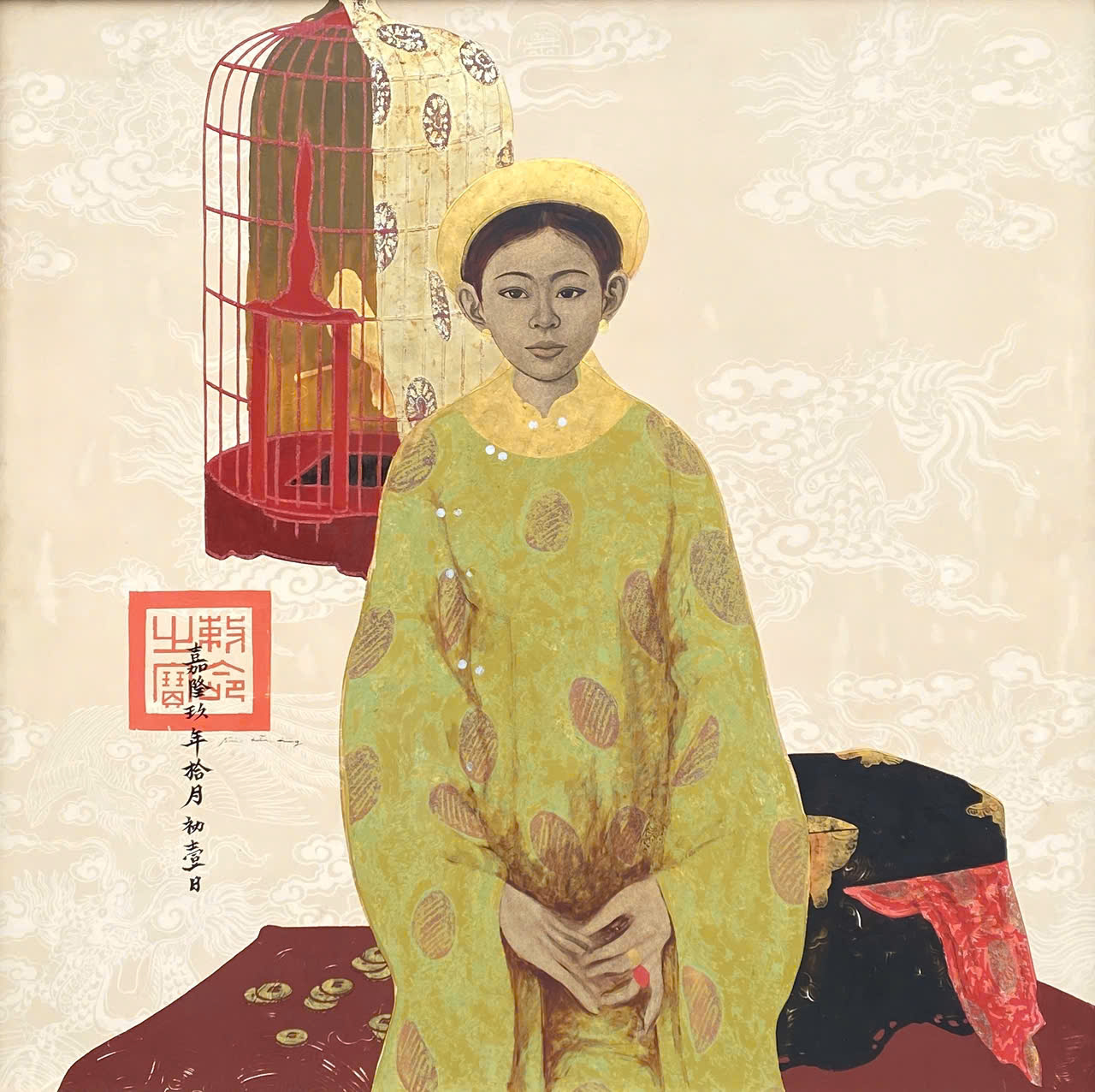“Royal Lady” khắc họa một người phụ nữ quý tộc đứng trang nghiêm, khoác chiếc áo dài cung đình màu vàng chanh lộng lẫy, gương mặt thanh tú và ánh mắt trầm tĩnh. Chi tiết nổi bật là chiếc lồng chim sơn mài màu đỏ và vàng lớn treo phía sau, tượng trưng cho sự giam hãm và vẻ đẹp tinh tế của cuộc sống cung đình. Bên phải là chiếc mũ quan được đặt trên một chiếc bàn thấp, cùng với những đồng tiền cổ nằm rải rác trên nền vải đỏ, gợi lên quyền lực và tài sản. Thông qua sự kết hợp của vẻ đẹp nhân vật và những vật phẩm mang tính biểu tượng, họa sĩ Bùi Hữu Hùng truyền tải thông điệp về sự cô đơn, ràng buộc, và gánh nặng của quyền lực, đồng thời tôn vinh vẻ đẹp vĩnh cửu của người phụ nữ Việt Nam.