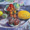 “Sắc xanh dịu lành” sáng tác năm 2024, mang đến một lọ hoa violet bung nở trên nền hồng nhạt, gợi nên cảm giác nhẹ nhõm và bình yên. Bút pháp sơn dầu giàu nhịp điệu, những mảng màu đan xen và cọ quét tự nhiên tạo hiệu ứng rung rinh như hoa còn đang lay động. Bức tranh là khoảnh khắc thẩm mỹ và cũng là lời nhắn gửi dịu dàng: giữa nhịp sống vội vã, vẫn luôn có những khoảng lặng trong trẻo để nuôi dưỡng tâm hồn.
