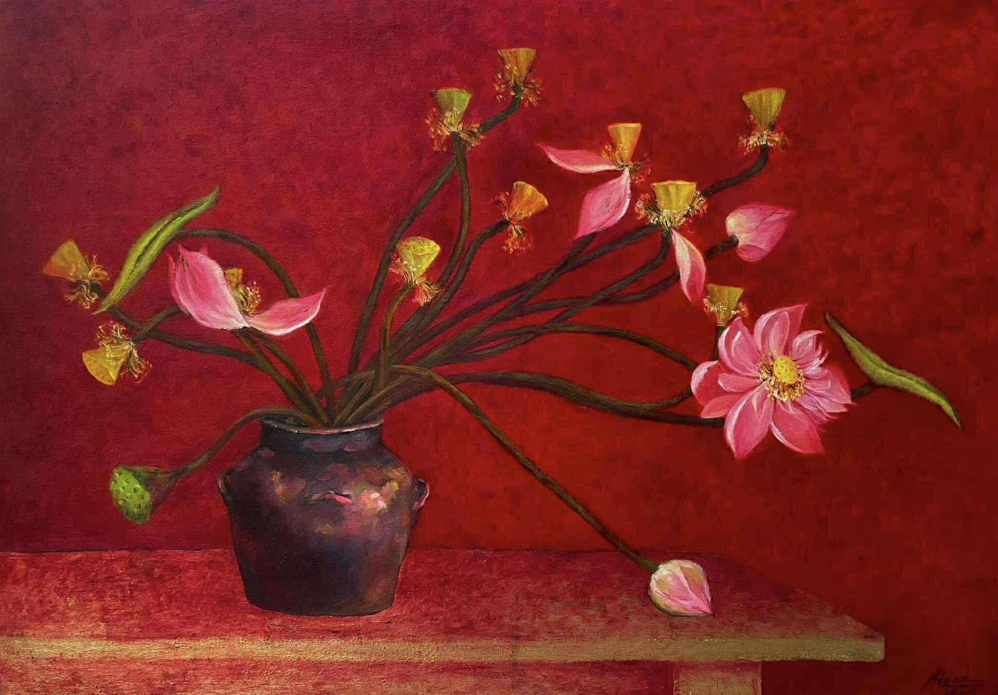 “Sen Mùa Hạ” sáng tác năm 2024, là bản hòa ca rực rỡ giữa sắc hồng và nền đỏ thẫm, nơi hoa sen – biểu tượng của sự thanh khiết trở nên mãnh liệt, sống động hơn bao giờ hết. Những cánh sen rũ xuống gợi dấu vết của thời gian, nhưng cũng là nhịp điệu của sức sống bền bỉ. Bố cục giản mà chắc, mảng màu đậm như chứa đựng hơi thở của nắng hạ, đưa người xem chạm vào vẻ đẹp vừa bình dị vừa thiêng liêng của tâm hồn Việt.