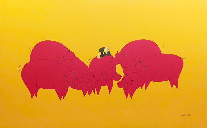 “Summer afternoon” sáng tác năm 2020, là một khúc ca đồng quê đầy sức sống và hóm hỉnh. Trên nền vàng rực rỡ như ánh nắng trưa, những chú trâu hồng được tạo hình giản lược nhưng sinh động, quây quần bên cậu bé mục đồng nhỏ bé. Sự tương phản giữa diện tích lớn nhỏ, đỏ vàng, gợi cảm giác hồn nhiên, vui tươi và no đủ. “Summer afternoon” hòa trộn giữa mỹ cảm dân gian và tinh thần hiện đại, nơi người xem không chỉ thấy cảnh vật, mà còn cảm nhận được cả mùi nắng, hơi đất và nhịp sống yên bình của làng quê Việt.