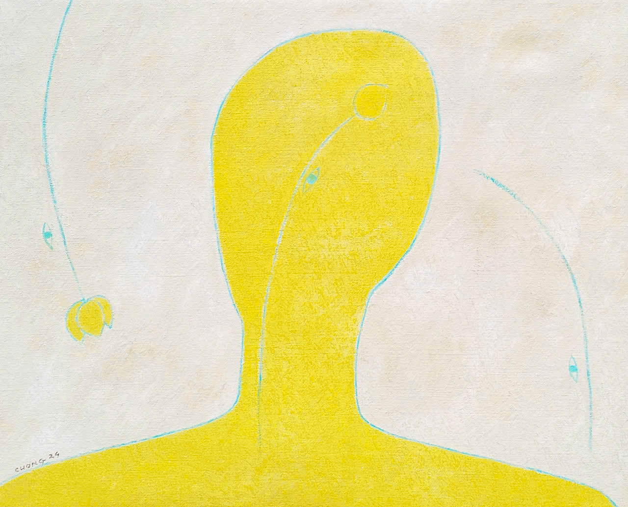 “Summer noon” sáng tác năm 2024, là một khoảng lặng của ánh sáng và ý niệm. Sắc vàng phủ khắp bề mặt gợi cảm giác nắng như đang lan vào bên trong người xem, nơi hình thể chỉ còn là cái cớ để nói về tâm trạng. Những đường nét mảnh như hơi thở xanh vẽ ra chuyển động tinh tế của sự sống, có thể là gió, là dòng ý nghĩ, hay là linh hồn của một buổi trưa mùa hạ. Trong sự giản lược đến tối đa, bức tranh gợi nên một thiền cảm, nơi mọi vật không tách rời mà hòa tan vào không gian của tĩnh tại và ánh sáng.