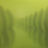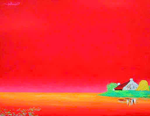 “Sunset” sáng tác năm 2015, là khoảnh khắc hoàng hôn được chưng cất đến tận cùng của cảm xúc. Màu đỏ chiếm trọn không gian, không phải để tả trời, mà để tả nhiệt độ của tâm hồn, nơi ánh sáng và ký ức hòa làm một. Căn nhà nhỏ, đống rơm, đôi người bên bờ ruộng trở thành những dấu lặng trong bản giao hưởng rực rỡ. Hùng giản lược chi tiết đến mức tối đa, để mỗi gam màu trở thành ngôn ngữ của cảm giác. “Sunset” là bức tường lửa dịu dàng giữa ngày và đêm, giữa hiện thực và giấc mơ.