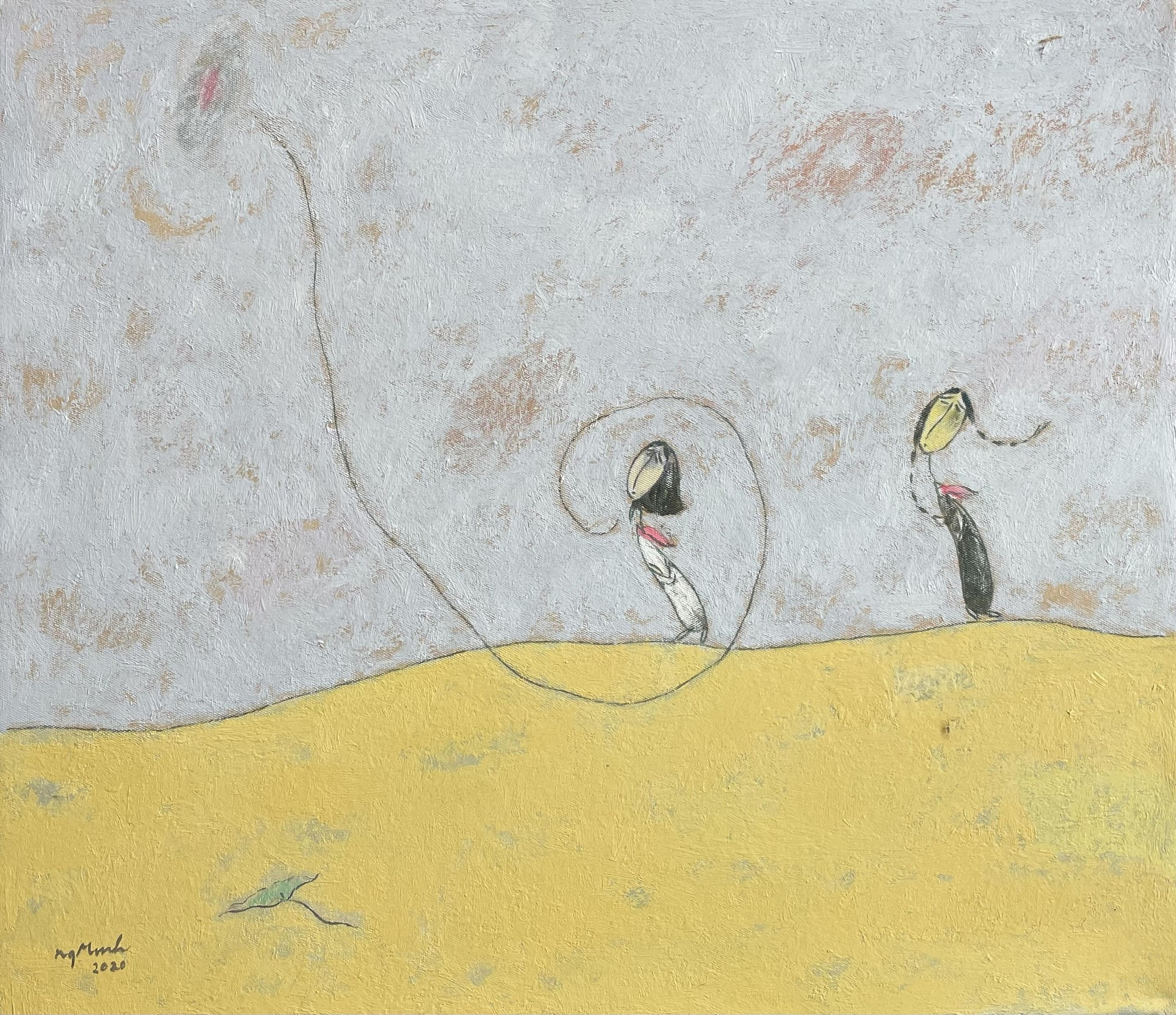 “Thả Diều” sáng tác năm 2020, mở ra ký ức tuổi thơ nơi vùng quê, với hình ảnh cô bé thả diều trên triền đê vàng ấm, gió nâng cánh diều bay lượn giữa bầu trời thênh thang. Bút pháp tối giản, đường nét tinh gọn và mảng màu phẳng tạo nên sự nhẹ nhõm, khoáng đạt. Cảnh tượng gợi cảm giác thanh bình, như lời gọi trở về với miền ký ức trong trẻo, nơi niềm vui giản đơn kết tinh thành hạnh phúc bền lâu và trở thành dấu ấn dịu dàng trong tâm hồn.